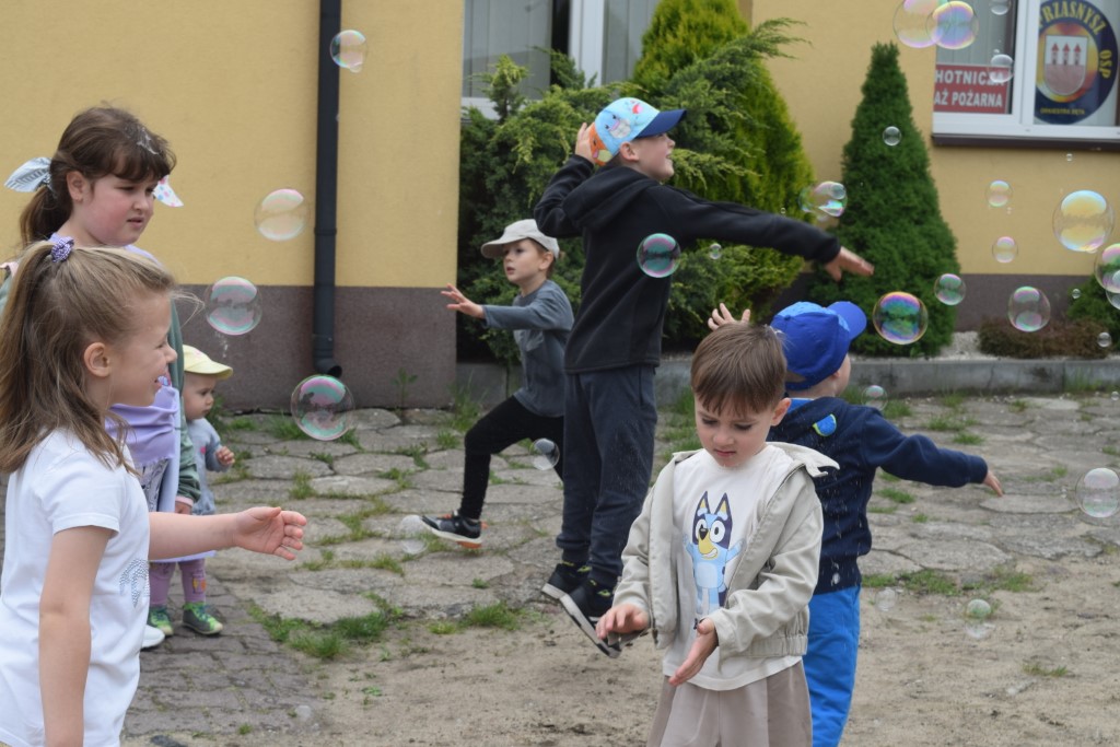 W ciepły, radosny poranek z okazji Dnia Dziecka nasza Biblioteka zamieniła się w krainę kolorów, śmiechu i dziecięcej radości! Już od pierwszych chwil dzieci z zachwytem wpatrywały się w niezwykły pokaz ogromnych baniek mydlanych – tęczowe kule unosiły się w powietrzu, tańczyły na wietrze i pękały z cichym „puf”, wzbudzając okrzyki zachwytu i salwy śmiechu.