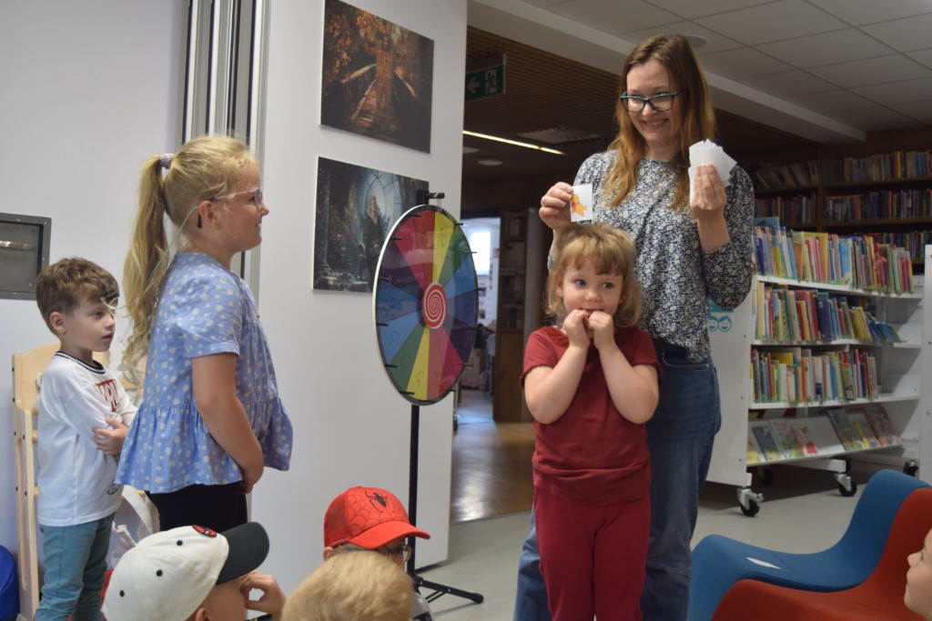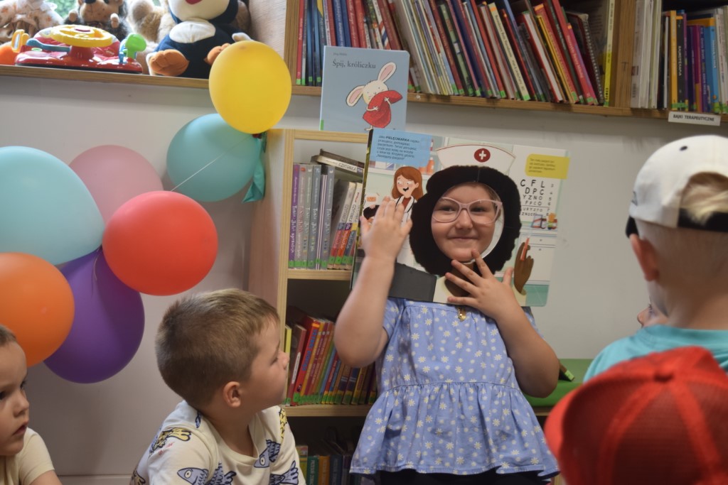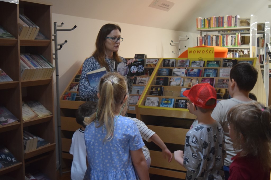 Dzieci dowiedziały się jak zostać naszym czytelnikiem oraz jak wziąć udział w akcji "Mała książka - wielki człowiek’" i otrzymać Wyprawkę Czytelniczą. Następnie wzięły udział w zabawie czółko, w której uczestnicy starali się odgadnąć tytuł bajki, która przymocowana była na czole zgadującego dziecka. Na zakończenie wykonali prace plastyczną, zaprojektowały okładkę ulubionej książki.