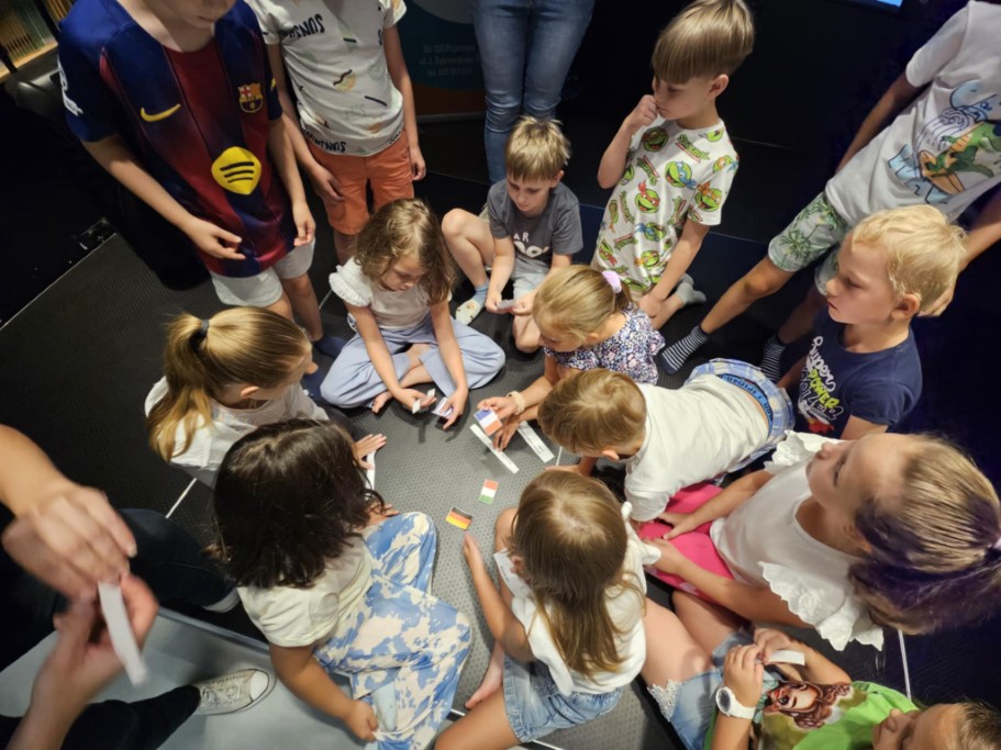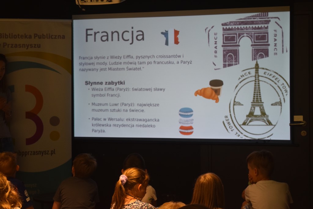 Dzisiejszy dzień zajęć wakacyjnych w bibliotece upłynął pod znakiem europejskich przygód! Podczas wspólnej rozmowy poznawaliśmy najciekawsze kraje Europy – ich stolice, zabytki i charakterystyczne symbole. Odwiedziliśmy wyobraźnią m.in. Hiszpanię, Francję, Niemcy, Polskę i Wielką Brytanię, ucząc się jednocześnie wielu ciekawostek o kulturze i historii tych miejsc.