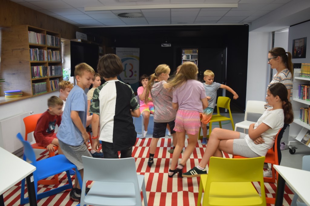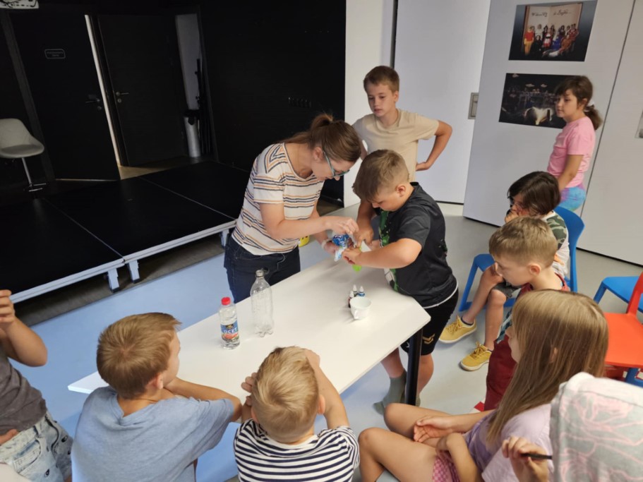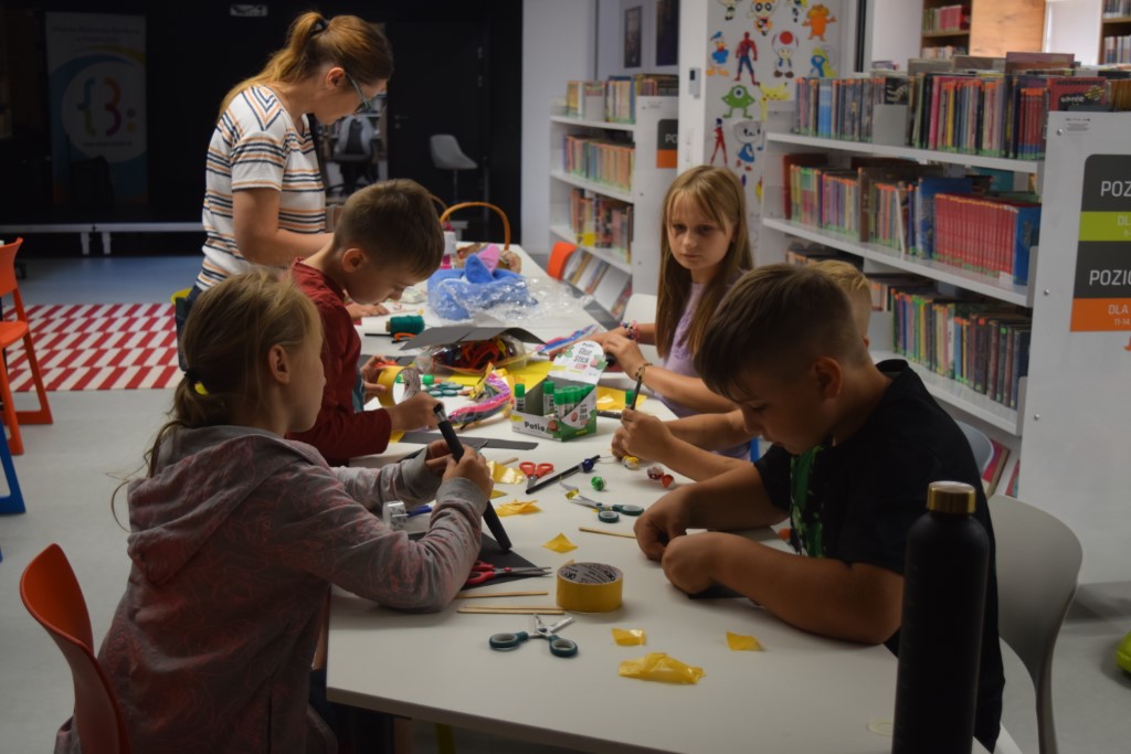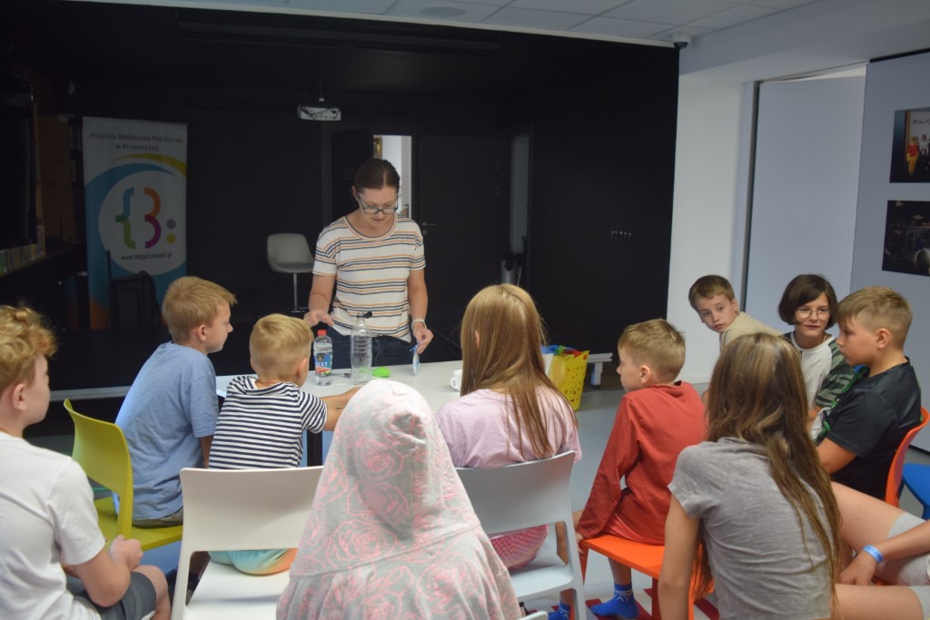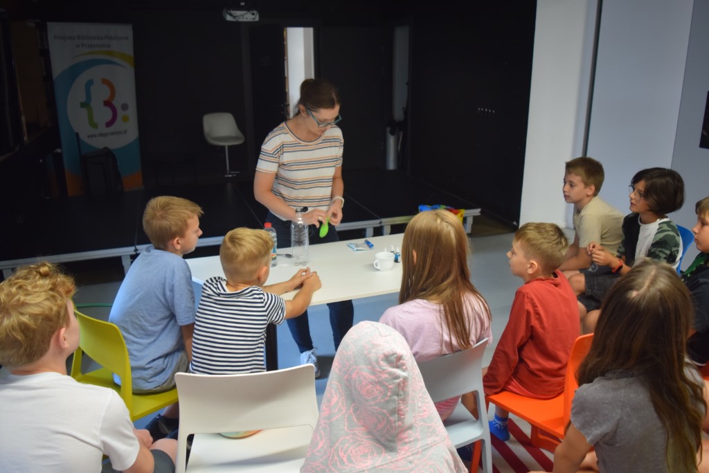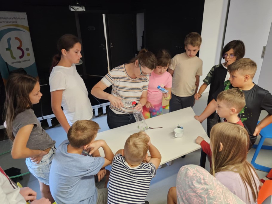 Przedostatni dzień Wakacji z Biblioteką upłynął w magicznej atmosferze fantastyki. Zajęcia rozpoczęliśmy od zabaw ruchowych i integracyjnych. Następnie dzieci przeniosły się do czarodziejskiego świata fantasy – dowiedziały się, czym wyróżniają się magiczne opowieści i poznały bohaterów znanych książek. Następnie każdy uczestnik stworzył własną różdżkę, ozdabiając ją według własnego pomysłu kolorowymi materiałami, brokatem i błyszczącymi dodatkami. Kolejnym punktem programu były pokazy w ramach warsztatów Mały Al-chemik. Aby przeprowadzić proste doświadczenia, nie potrzeba profesjonalnego sprzętu ani odczynników – wystarczy to, co mamy w domu. Podczas zajęć wykorzystaliśmy ocet, wodę, olej, sodę oczyszczoną, płyn do naczyń, pieprz i bibułę. Dzieci z zaciekawieniem obserwowały eksperymenty takie jak lampa lawa, nadmuchiwanie balona przy użyciu sody i octu czy uciekające kolory. To był dzień pełen inspiracji, który połączył świat wyobraźni z fascynującą stroną nauki – idealna wakacyjna przygoda w bibliotece.