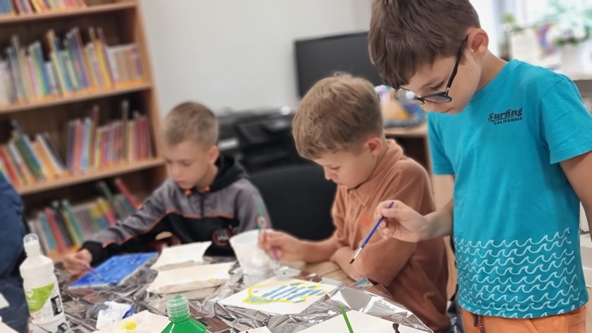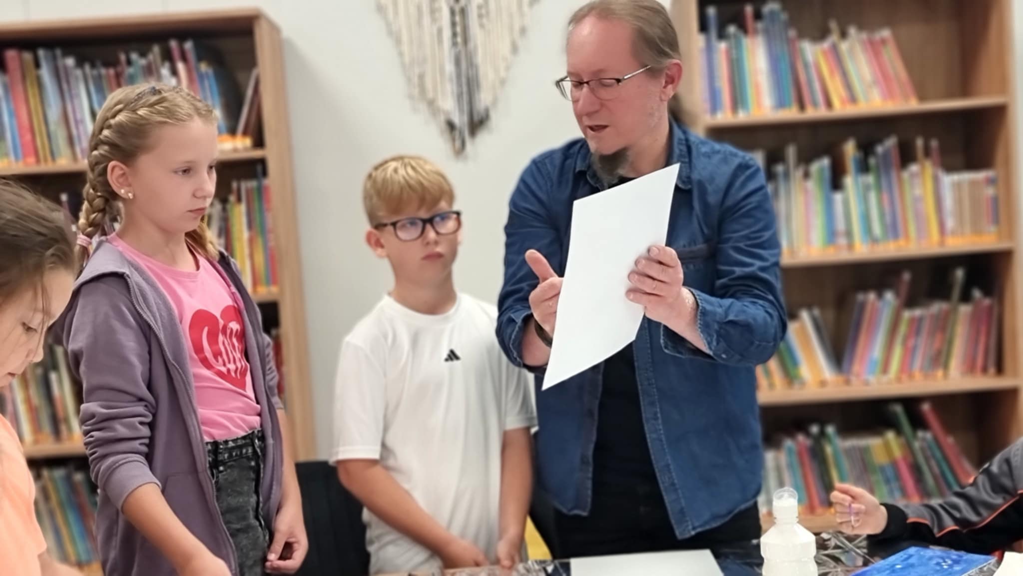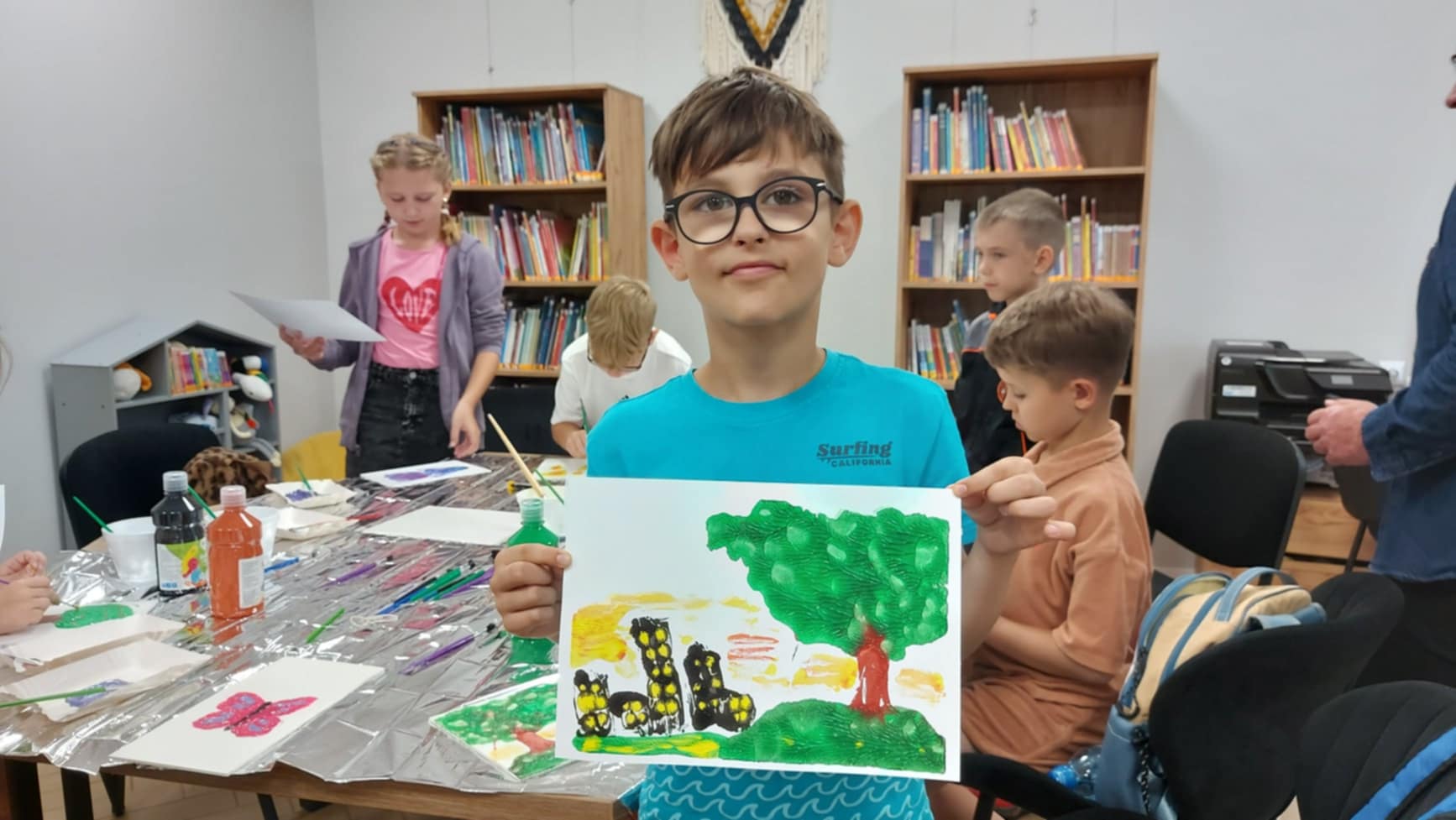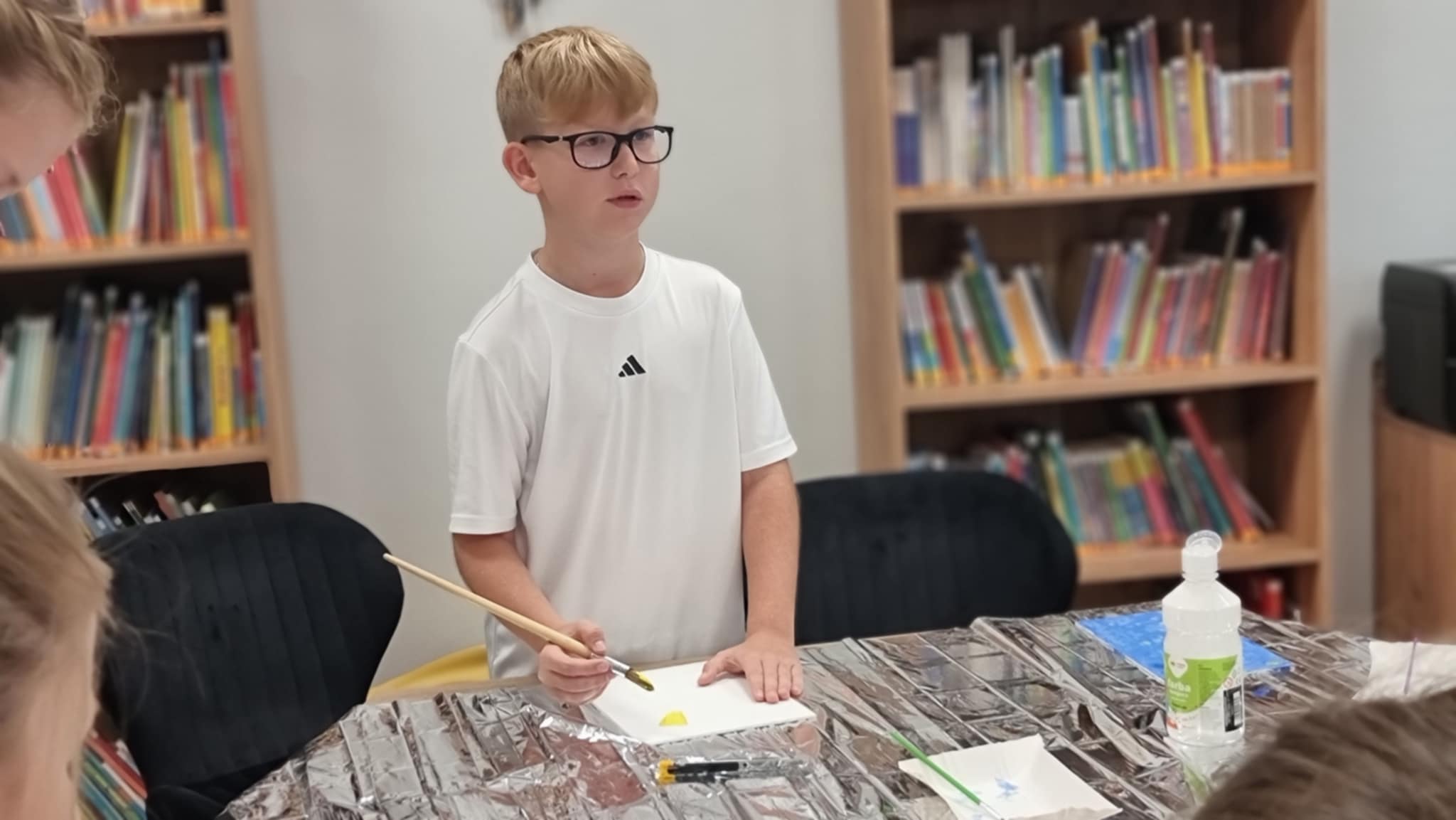 Na początek, aby lepiej się poznać i przełamać pierwsze lody, dzieci wzięły udział w integracyjnej zabawie „Pajęczynka”. Śmiechu i pozytywnej energii nie brakowało! Następnie uczestnicy przenieśli się w świat sztuki, poznając ciekawą technikę plastyczną – monotypię, czyli malowanie połączone z odbijaniem obrazu. Pod okiem naszego gościa dzieci tworzyły barwne, niepowtarzalne prace, eksperymentując z kolorami i formami. Zajęcia zakończyły się prezentacją powstałych dzieł i wspólnymi rozmowami o tym, co najbardziej się podobało. To był twórczy, pełen wrażeń początek wakacyjnych spotkań w bibliotece.