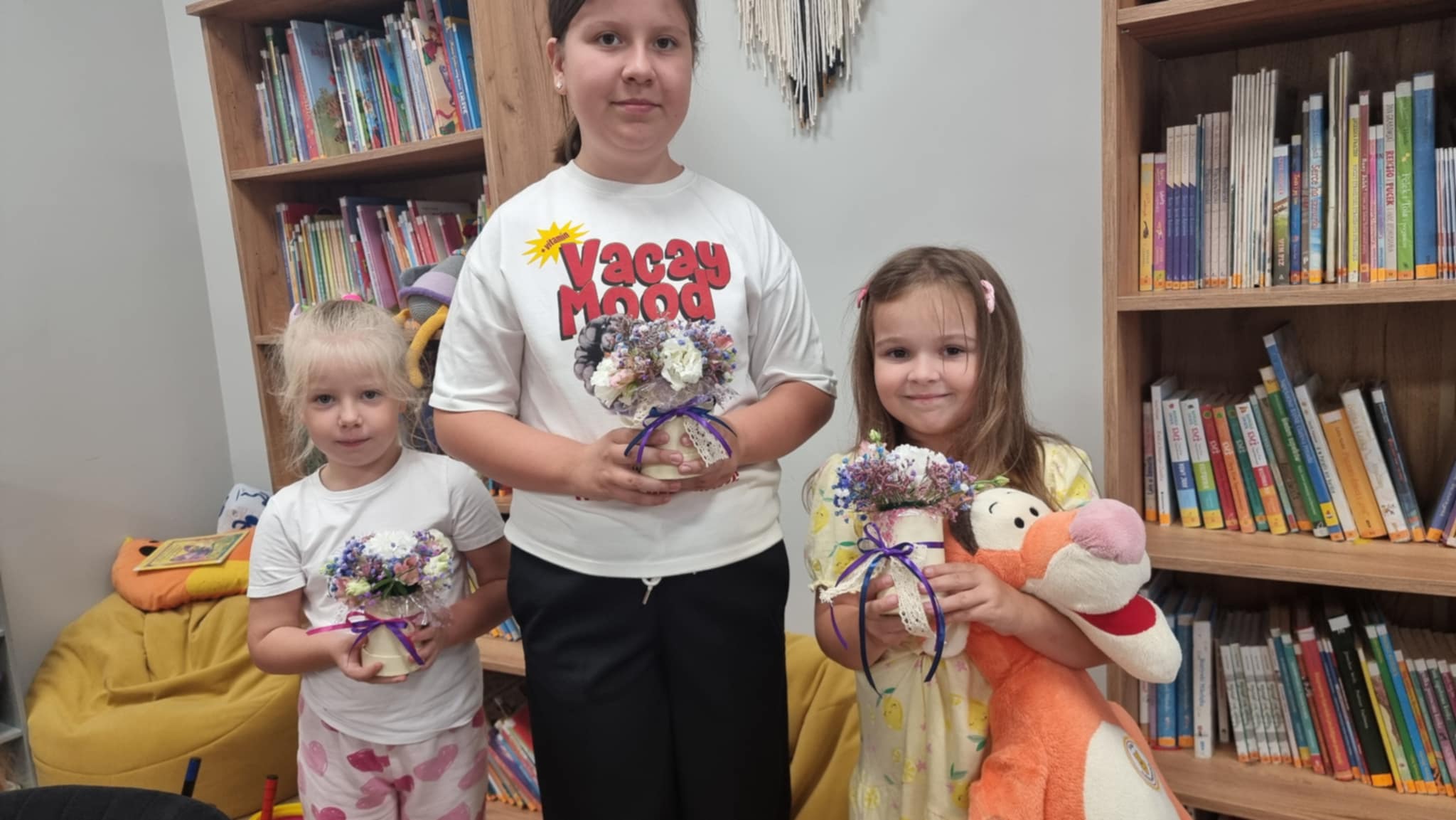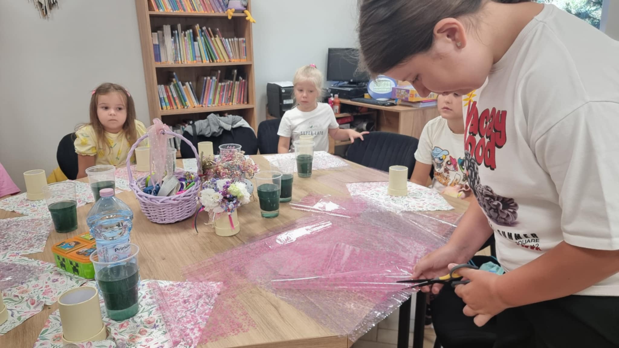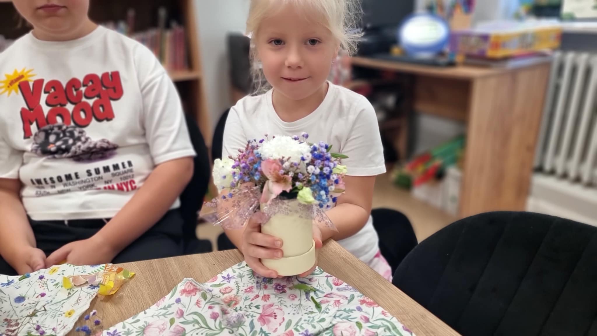 Dzisiejszy dzień wakacyjnych zajęć w Filii nr 1 upłynął w atmosferze twórczej zabawy i kontaktu z naturą. Dzieci miały okazję poznać tajniki florystyki, wykonując własne kompozycje kwiatowe w boxach. Na początku uczestnicy dowiedzieli się, czym jest gąbka florystyczna i dlaczego jej namoczenie jest tak ważnym etapem przygotowań. Następnie przystąpili do sortowania i przycinania kwiatów, ucząc się, jak odpowiednio je przygotować, aby dłużej zachowały świeżość i piękny wygląd. Najwięcej radości sprawiła jednak część praktyczna – dobieranie i układanie roślin w taki sposób, aby tworzyły harmonijną, estetyczną całość. Dzięki zajęciom dzieci nie tylko rozwijały swoją kreatywność i zmysł estetyczny, ale także zdobyły nowe umiejętności praktyczne. Każdy uczestnik mógł zabrać do domu własnoręcznie wykonaną kompozycję, która stała się piękną pamiątką z dzisiejszych warsztatów.