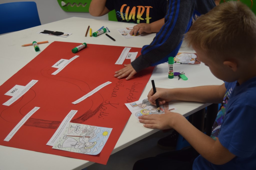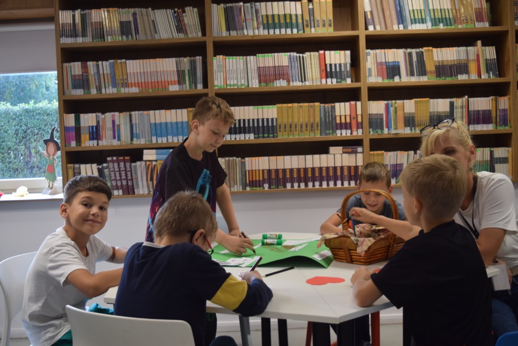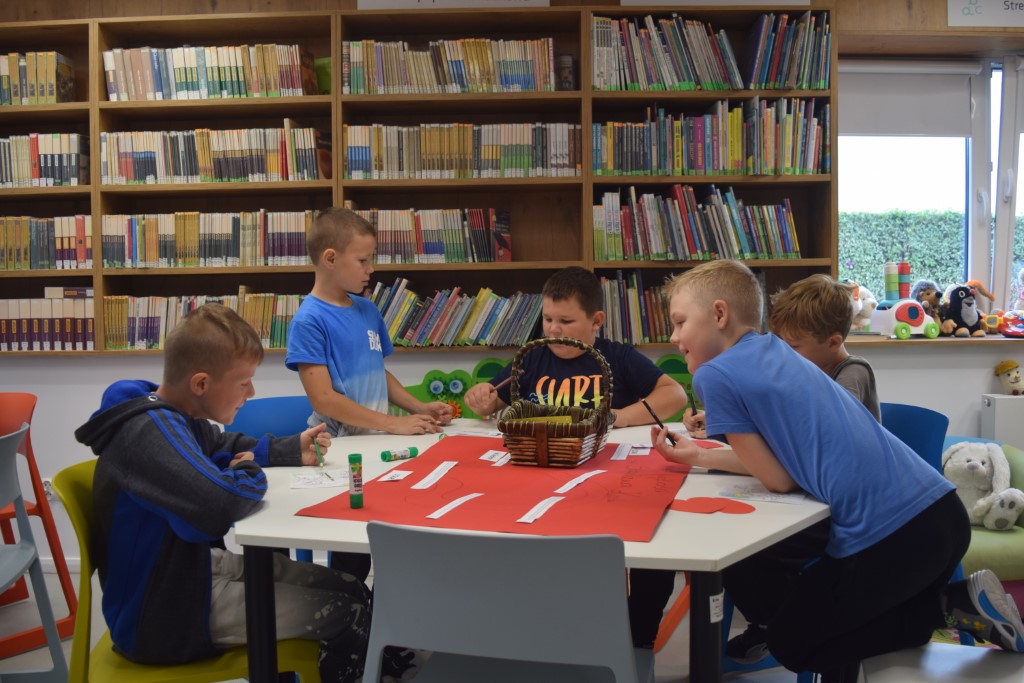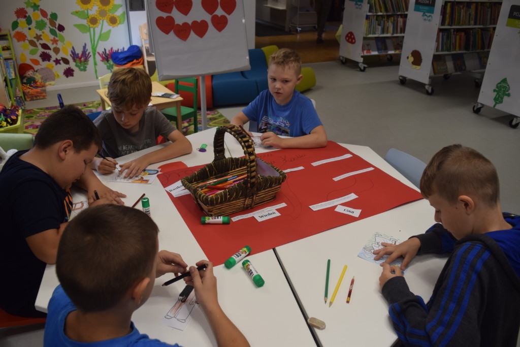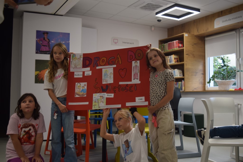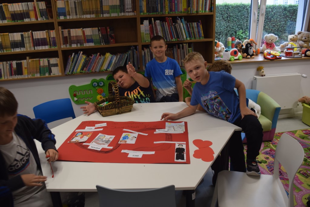 Dzisiejszego dnia Miejską Bibliotekę odwiedziła klasa III ze Szkoły Podstawowej nr 2 w Przasnyszu. Dzieci wzięły udział w zajęciach na temat Świętego Stanisława Kostki, który jest patronem dzieci i młodzieży oraz patronem naszego miasta Przasnysz. Na początku uczestniczyły w swobodnej dyskusji: z czym wam się kojarzy słowo ŚWIĘTY? Co to znaczy być Świętym? wymieniały świętych których znają. Następnie na papierowych serduszkach wymieniały cechy Świętego Stanisława Kostki. Podsumowaniem zajęć była praca plastyczna, klasa III wykonała trzy plakaty pt.,, Droga do świętości Św. Stanisława Kostki’’, które można oglądać w Oddziale dla Dzieci i Młodzieży.