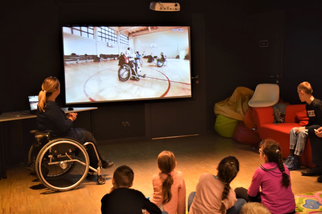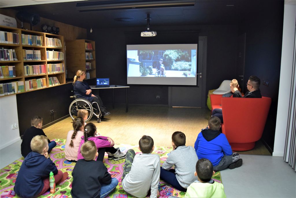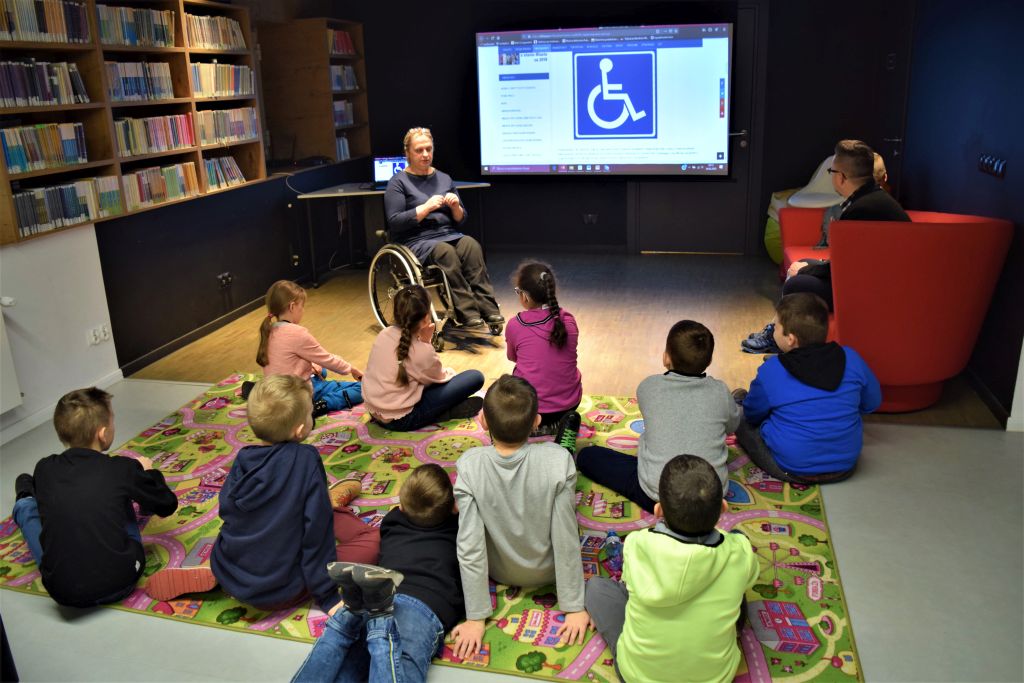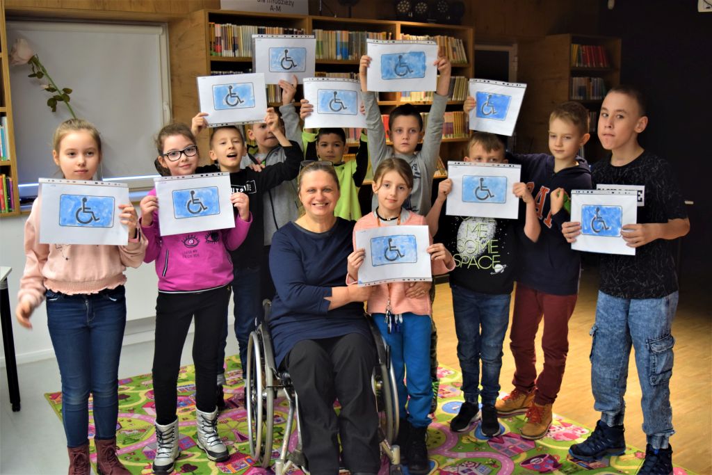 Zajęcia prowadziła Pani Małgorzata Sobiesiak - dyrektor Biblioteki, jednocześnie osoba poruszająca się na wózku inwalidzkim, instruktorka aktywnej rehabilitacji, mająca wieloletnie doświadczenie w pracy z dziećmi z niepełnosprawnością ruchową.
