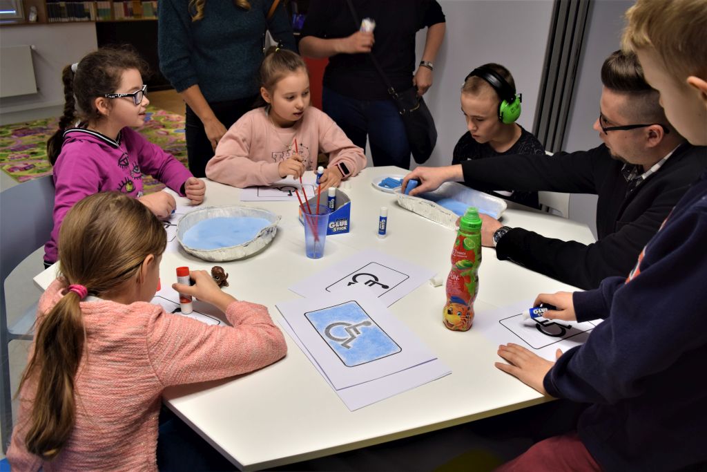 Ostatnią częścią spotkania było zadanie plastyczne - uczestnicy wykonali za pomocą specjalnej techniki emblematy ze znakiem "osoba z niepełnosprawnością".