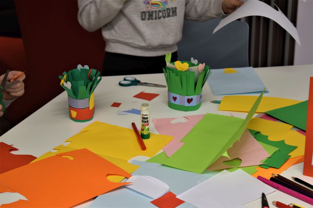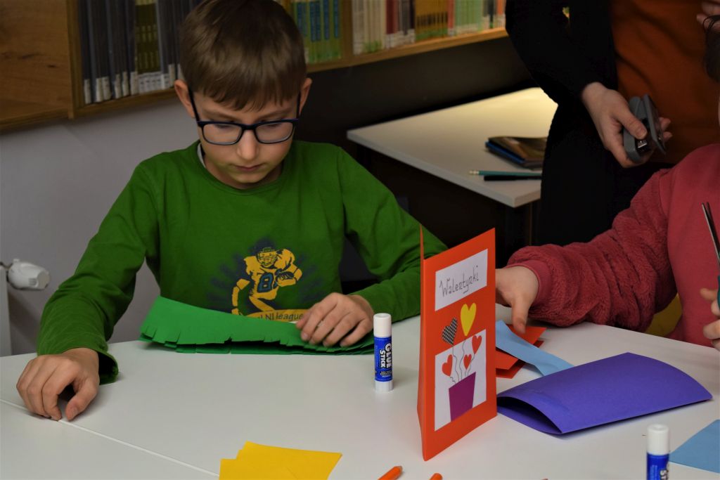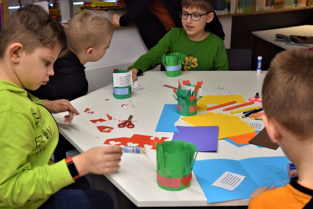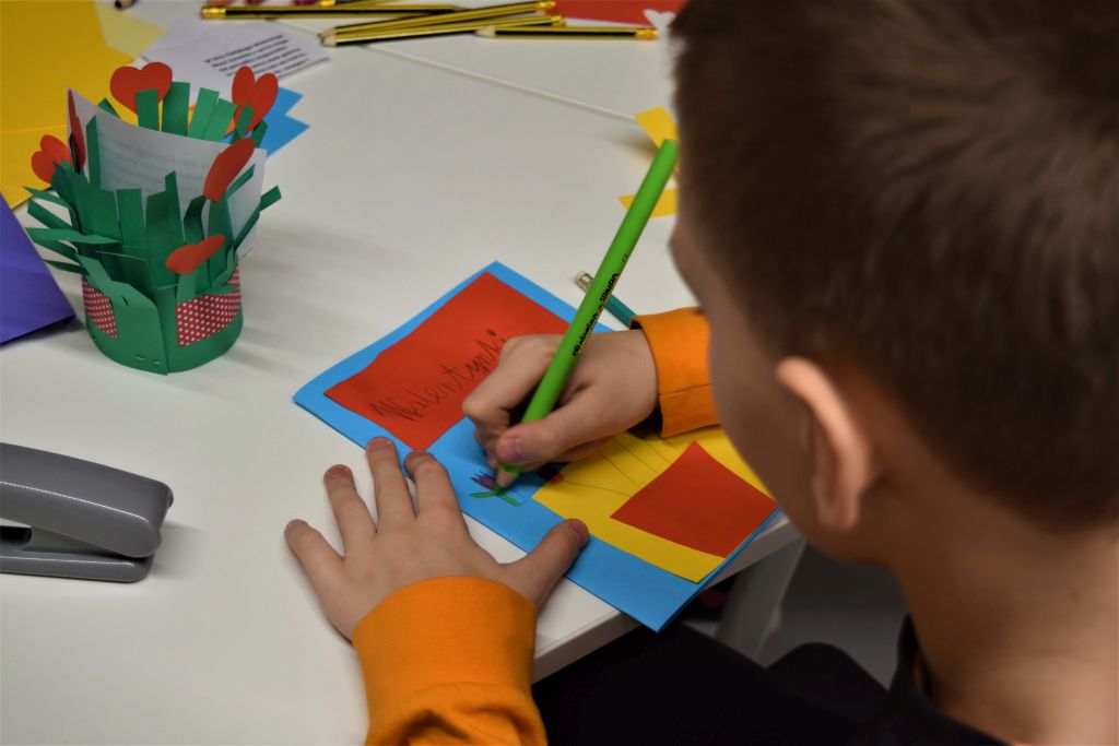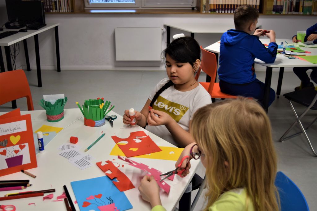 Dzieci rozwiązywały Quiz ,, Kto kogo kocha? Kto kogo lubi?’’, następnie przystąpiły do wykonania laurek i koszyczków walentynkowych. Powstały piękne prace, które uczniowie wzięli do szkoły i wręczą swoim bliskim w przyszłym tygodniu. Zajęcia przebiegły w miłej i przyjaznej atmosferze.