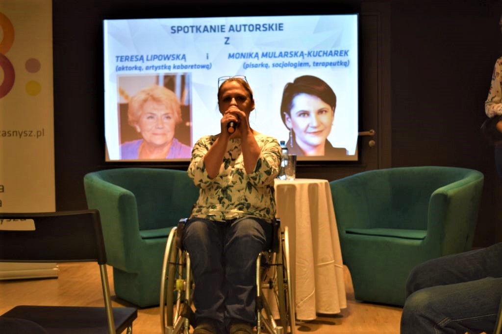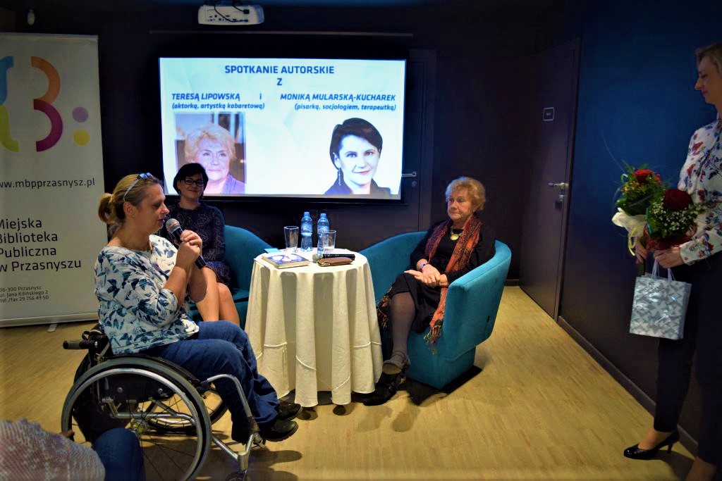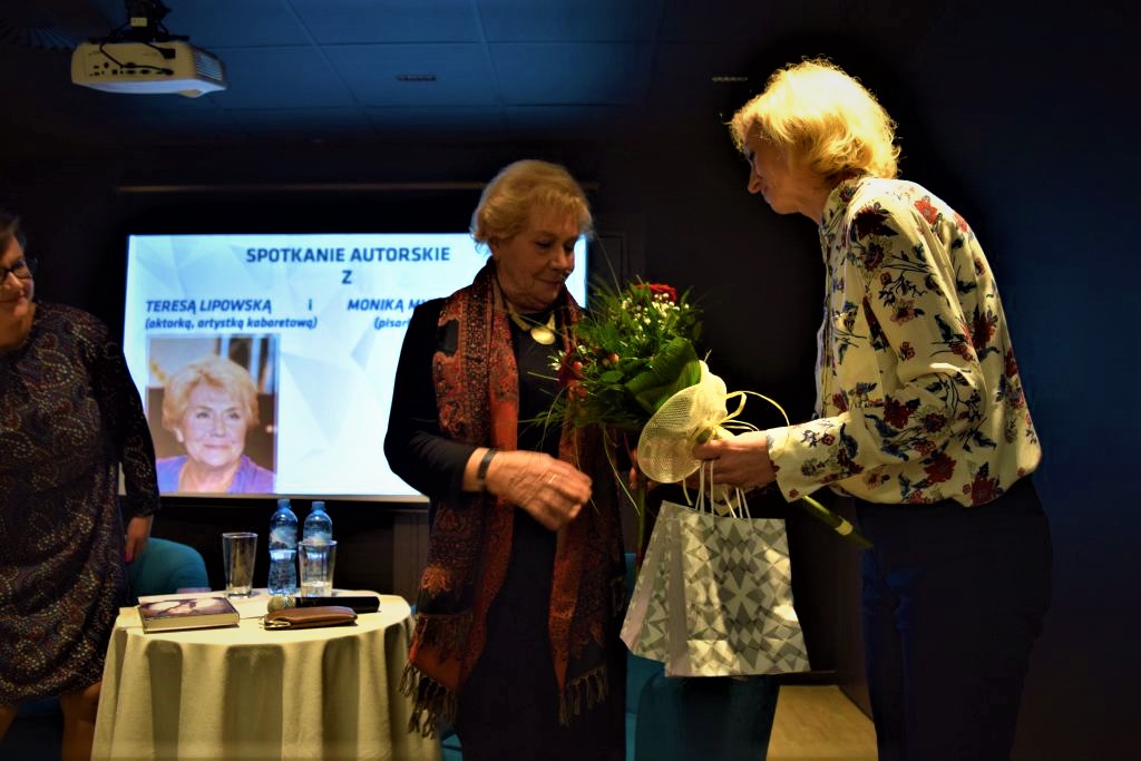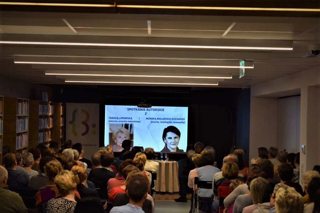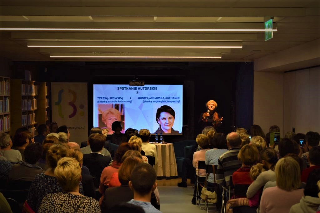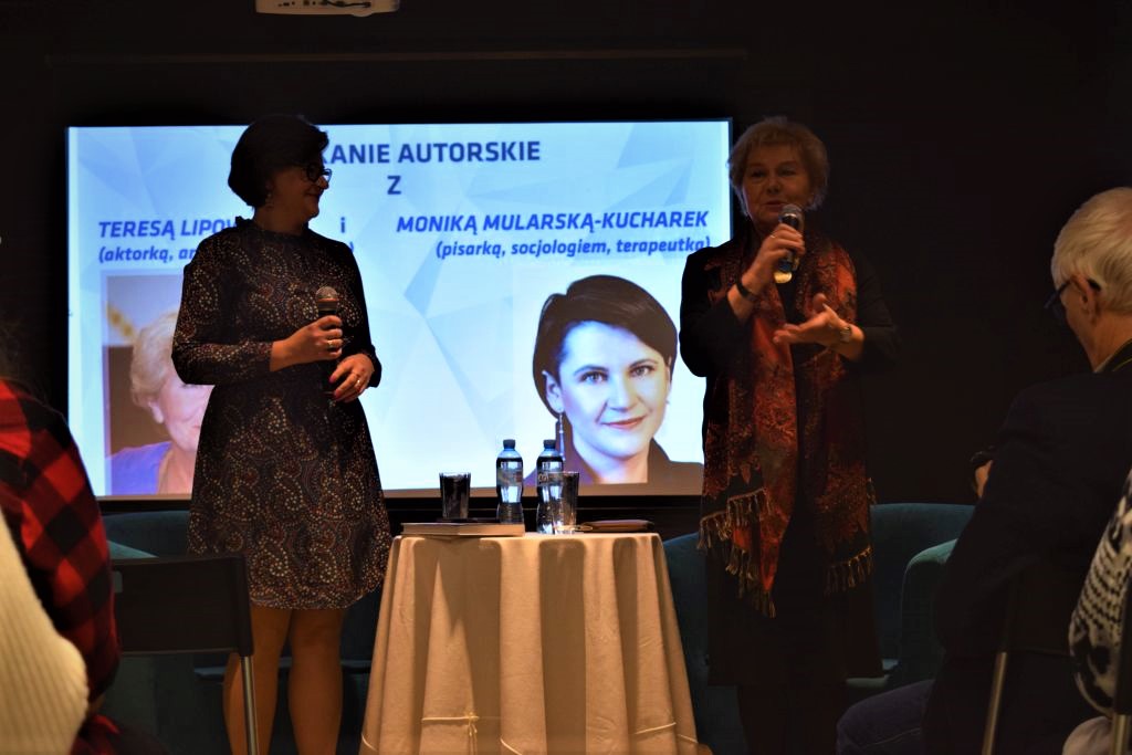20 listopada gościliśmy w Bibliotece dwie wyjątkowe kobiety Panią Teresę Lipowską jedną z najbardziej znanych polskich aktorek, artystkę kabaretową oraz Panią Monikę Mularską – Kucharek doktor socjologii, terapeutkę wykładowcę akademickiego Od wielu lat realizuje warsztaty dla osób starszych. Obie Panie rozmawiały na temat książki pt. „Nad rodzinnym albumem. Teresa Lipowska w rozmowach z Iloną Łepkowską”.