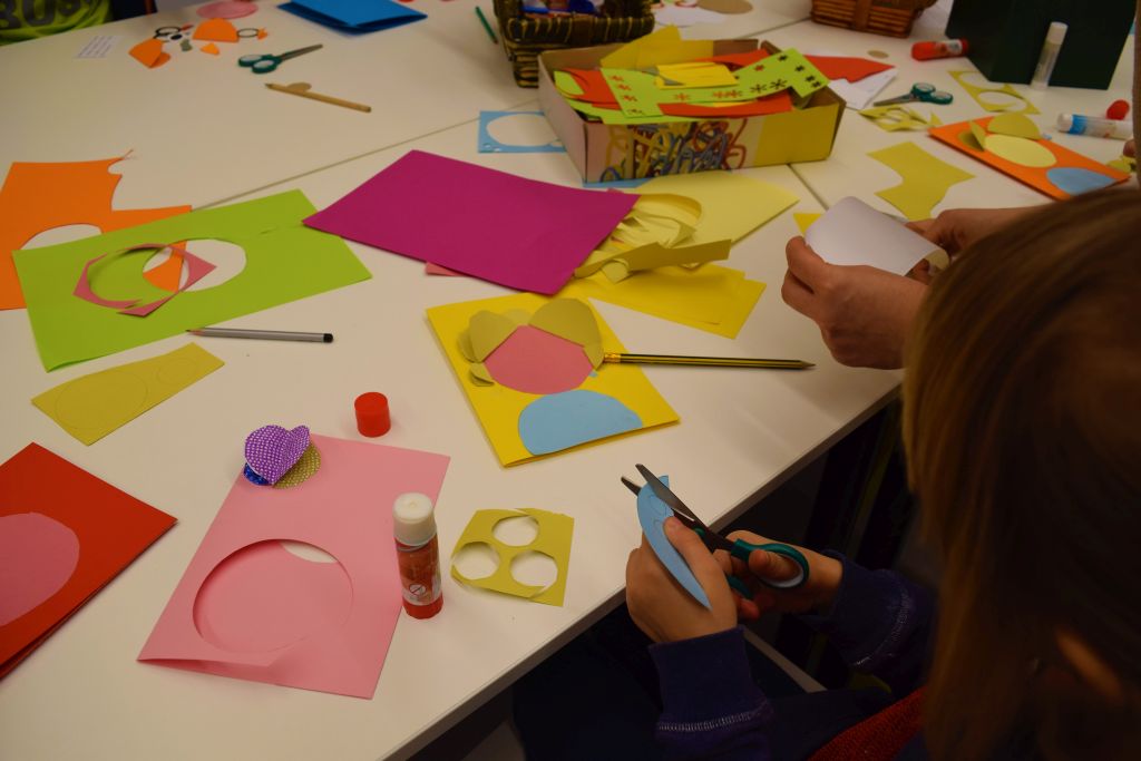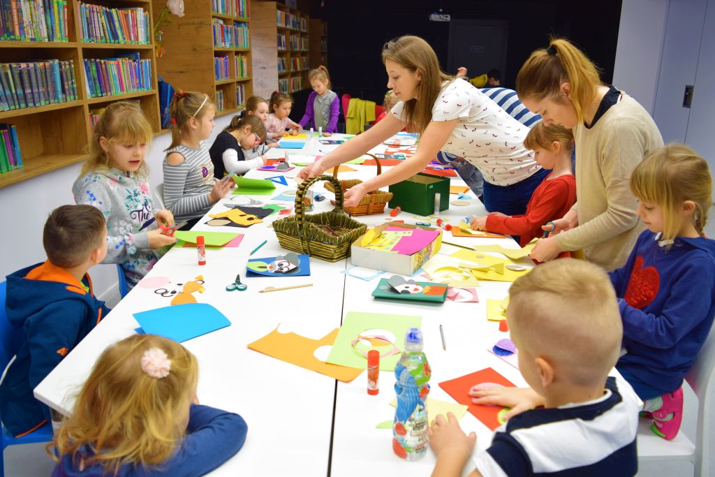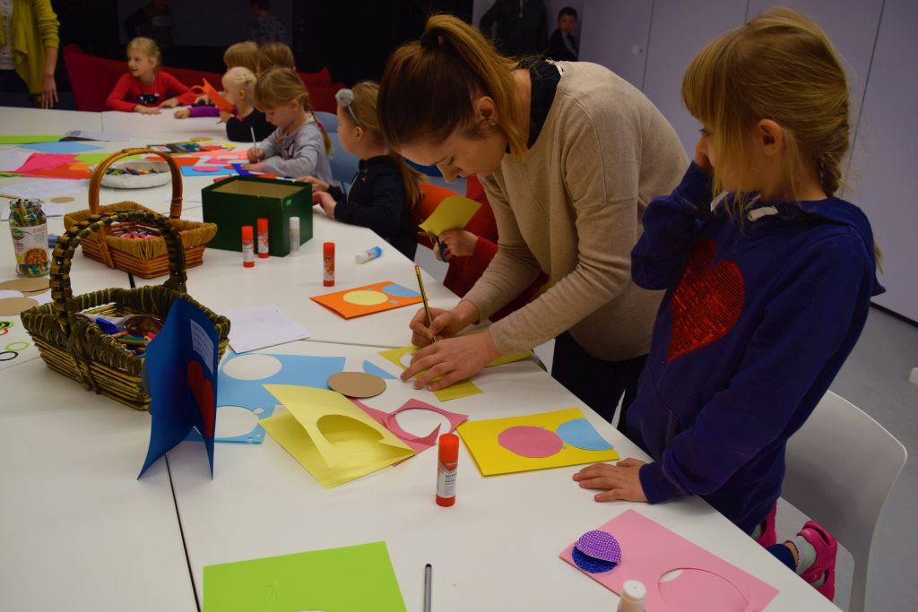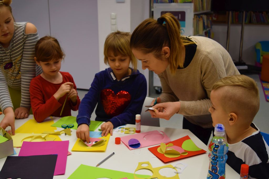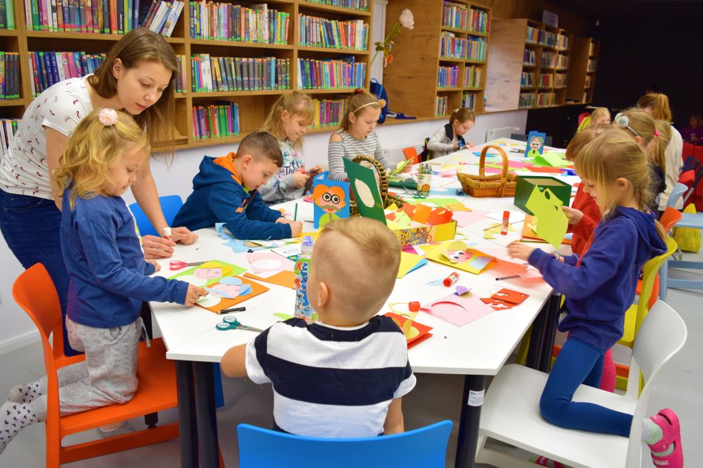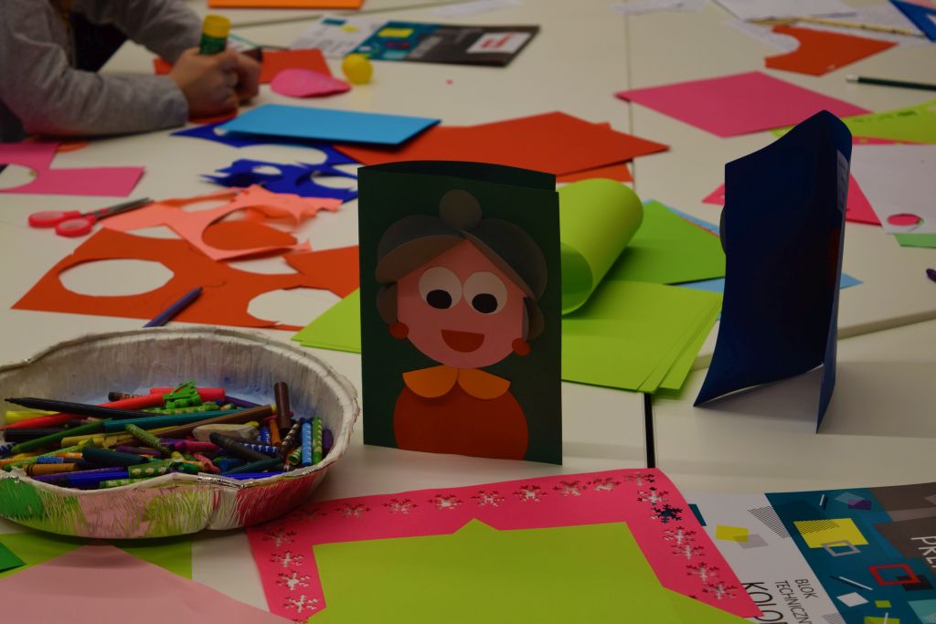 Podczas sobotniego Poranka z Biblioteką sala oddziału dla dzieci i młodzieży zamieniła się w fabrykę warsztatowo-plastyczną! Każdy uczestnik mógł wykonać laurkę z okazji dnia Babci i Dziadka.