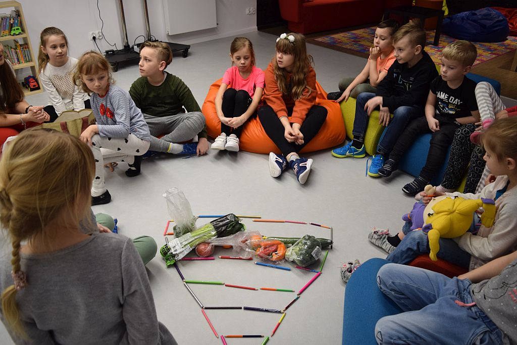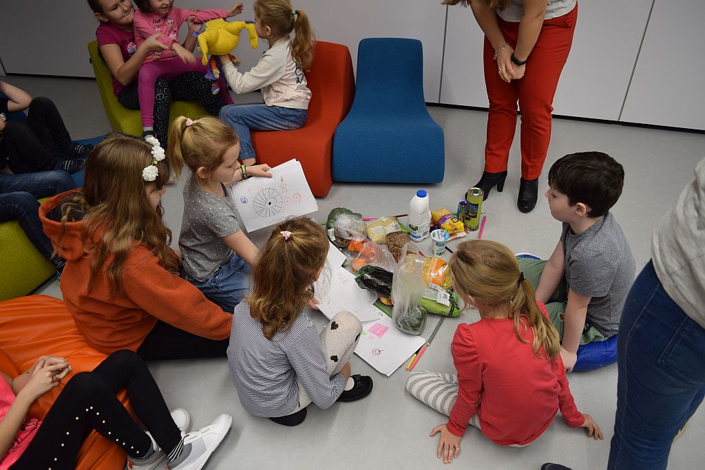 Druga część spotkania poświęcona była zdrowemu odżywianiu. W tematykę wprowadziła nas Pani Marta Pęczkowska z Powiatowej Stacji Sanitarno-Epidemiologicznej. Spotkanie zapoczątkowały zabawy integracyjne. Następnie przeszliśmy do zajęć plastycznych oraz rozmów na temat tego, czym nie warto się żywić. Podsumowaniem tej części zajęć była wspólnie ułożona piramida żywienia.