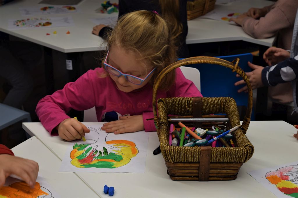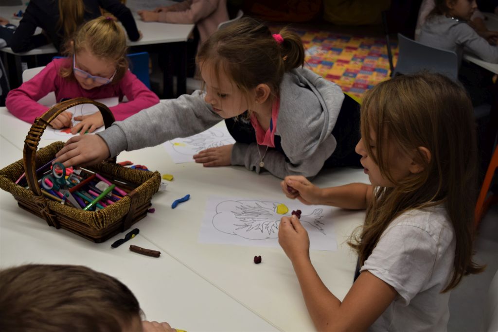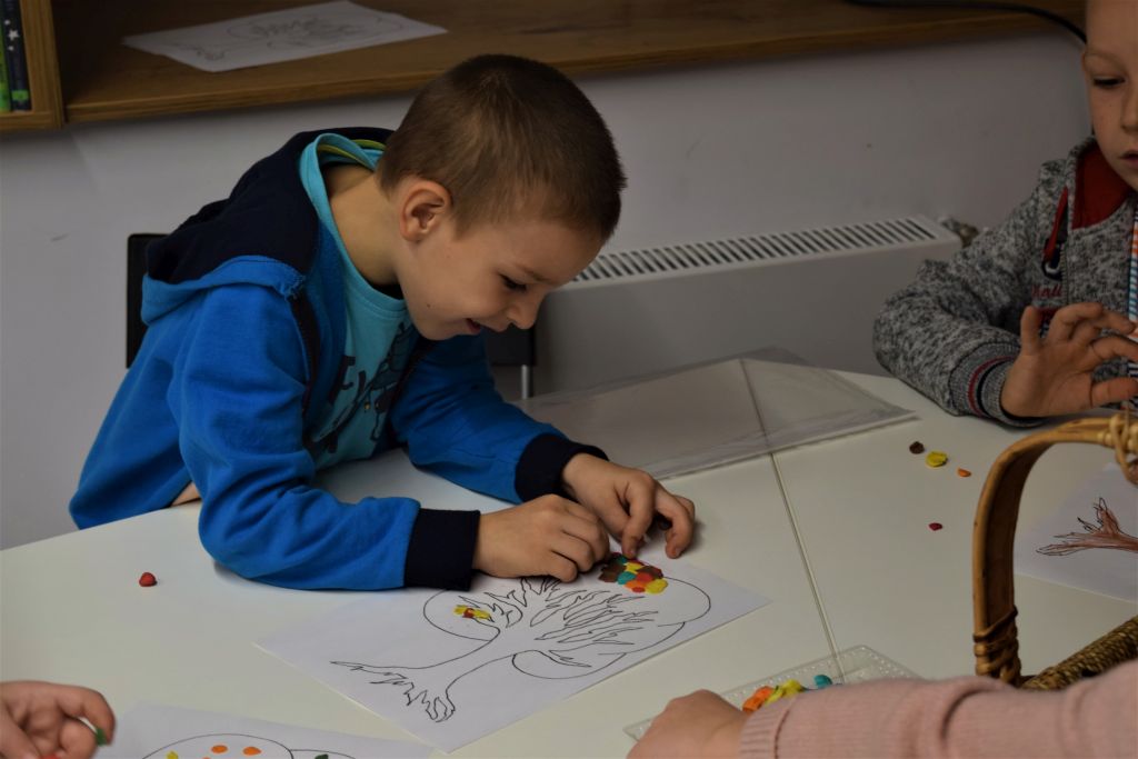 Wprowadzeniem do zajęć było znalezienie kopert, w których ukryte były jesienne zagadki. Stały się one pretekstem do rozmowy o aktualnej porze roku. Poruszaliśmy tematy zdrowego odżywiania, ubierania się oraz zmian zachodzących w przyrodzie. Następnie uczniowie wysłuchali wiersz pt. "Jesień u fryzjera’’ Doroty Gellner. Na koniec czekała na nas praca plastyczna pt. "Jesienne drzewa" wykonana przy użyciu plasteliny i kolorowych kredek.