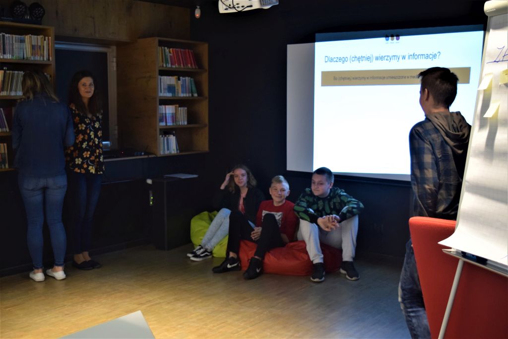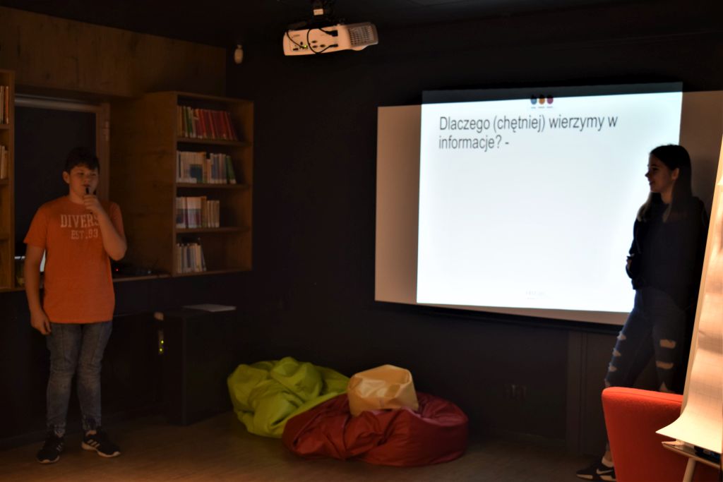 Zajęcia rozpoczęła rozmowa na temat fake newsów oraz przykładów z życia codziennego. Następnie zaprosiliśmy uczniów do przedstawienia się w taki sposób, aby każdy powiedział swoje imię oraz dwie informacje o sobie: jedną prawdziwą, drugą fałszywą. Zadaniem pozostałych było odgadnięcie prawdziwej informacji. W drugim ćwiczeniu klasa pracowała w grupach nad otrzymanym artykułem, a ich zadaniem było wypisanie na karteczkach argumentów za wiarygodnością artykułu oraz przeciw. Następnie uczniowie odgrywali scenki pokazujące dlaczego wierzymy w nieprawdziwe informacje. Poradzili sobie znakomicie!