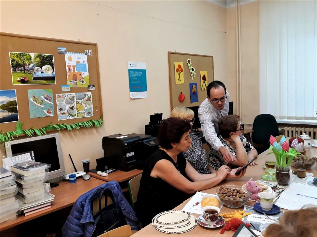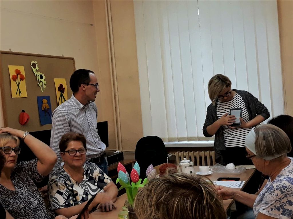 Trwają szkolenia dla seniorów podczas których poznają zasady działania czytnika książek elektronicznych i ich wielorakie funkcje.