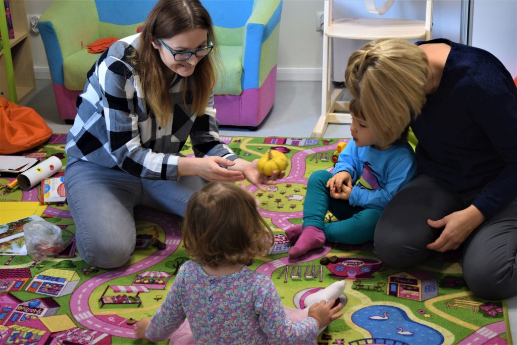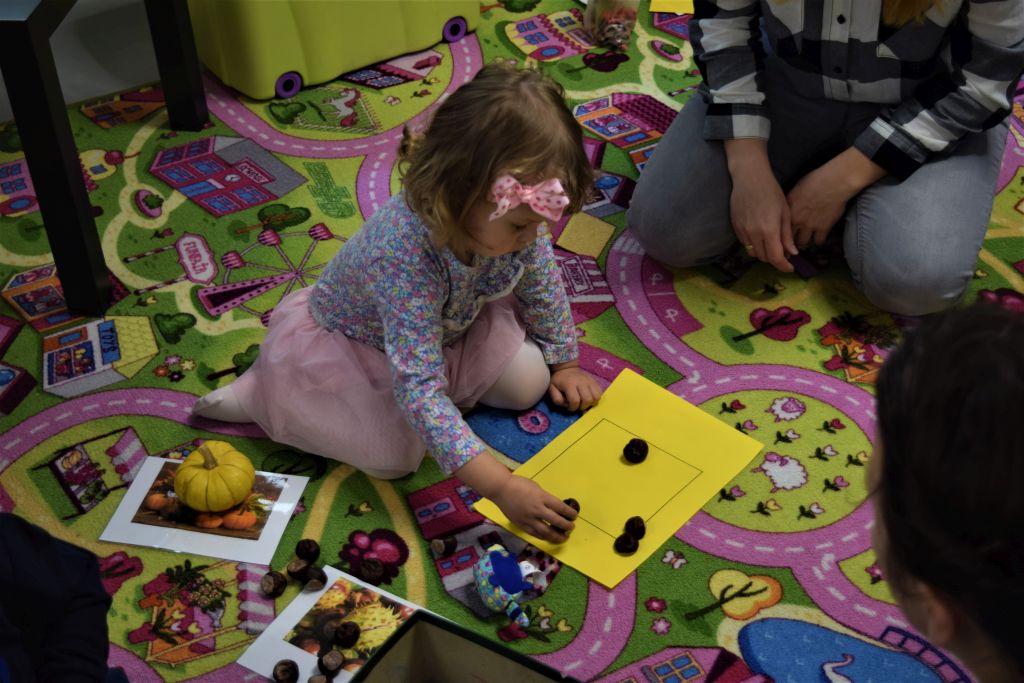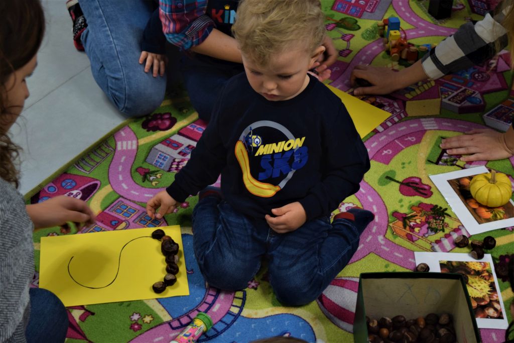 W klimat tej pory roku wprowadził nas wiersz. Głośne czytanie przeplatano rozmową z maluszkami na temat zmian jakie zachodzą jesienią w przyrodzie. Dzieci poznały dary jesieni - kasztany, żołędzie, jarzębinę i dynię. Rozwijały zmysł dotyku, każdy mógł dotknąć, obejrzeć i bawić się. Z kasztanów układały po śladzie ślimaczki, kwadraty i literki. Tańczyły przy piosence ,, Kółko graniaste’’. Wykonały pracę plastyczną – jesienną dynię przy użyciu plasteliny. Dodatkową atrakcją zajęć były bańki mydlane.