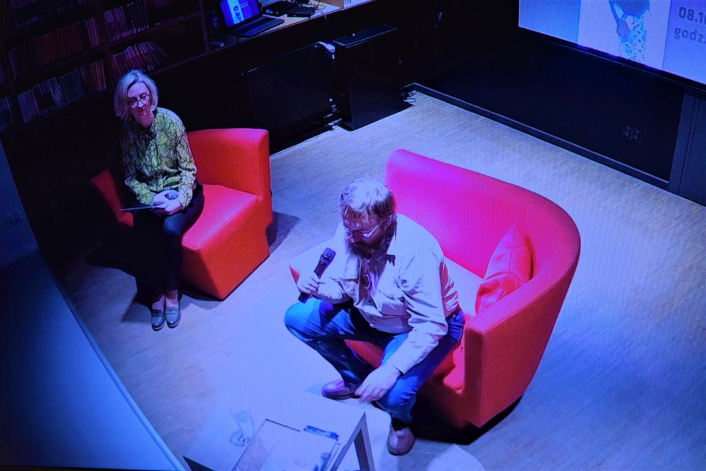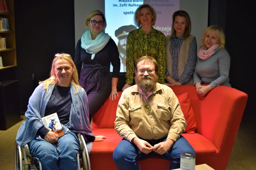 Rozmawialiśmy o Jakubie Wędrowyczu i Wojsławicach,w których odbywa się Festiwal Miłośników Fantastyki ,o motywach stworzenia cyklu o kuzynkach Kruszewskich oraz o cyklu” Oko jelenia „ gdzie wszystko rozpoczyna się jak u Hitchcocka ,a napięcie stale rośnie. Autor opowiadał o początkach swojej pracy twórczej, o codziennym życiu, w którym łączy pracę pisarza z obowiązkami ojca i męża. Dowiedzieliśmy się też o jego planach literackich na najbliższą przyszłość. Obecni na spotkaniu liczni fani pisarza zadawali wiele pytań, na które odpowiadał z humorem wplatając wiele ciekawych historii i anegdot. Na koniec można było zakupić książkę ,bądź kalendarz z Jakubem Wędrowyczem i otrzymać autograf. Gość sprawił Bibliotece niezwykłą niespodziankę, podarowując grafikę. To było FANTASTYCZNE popołudnie!