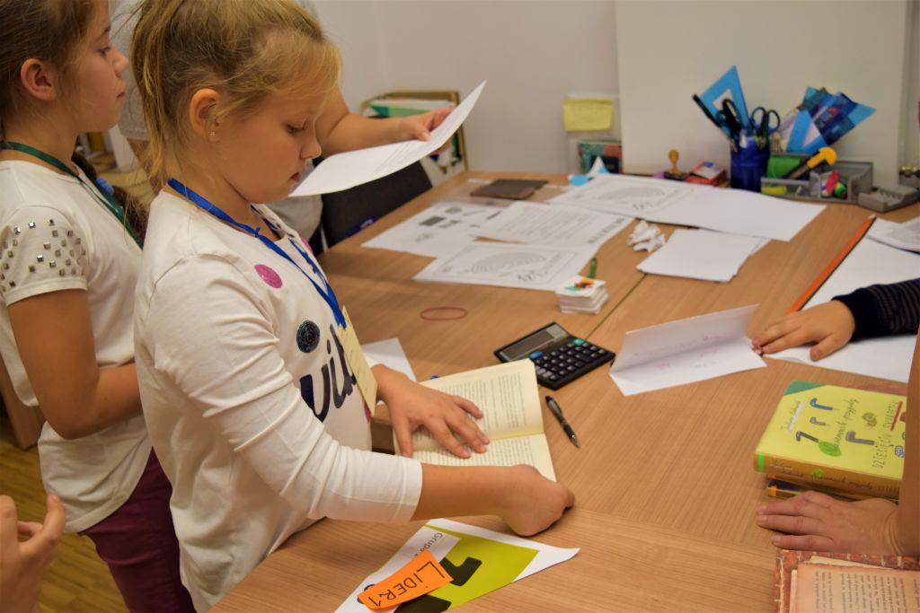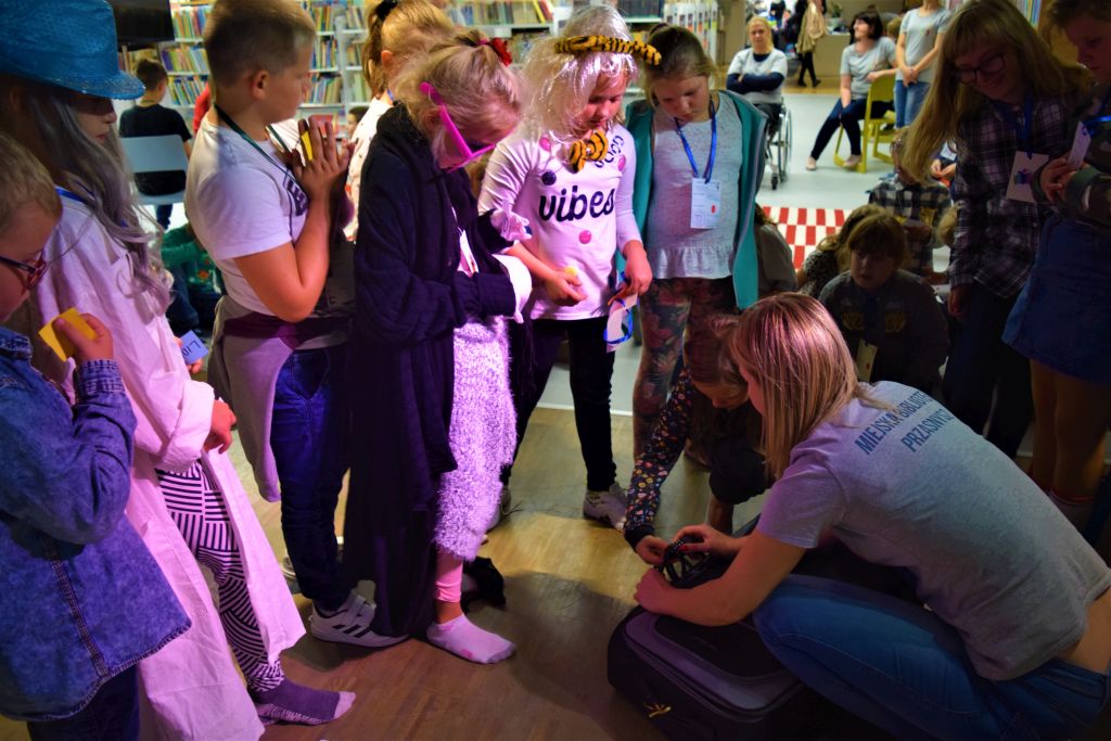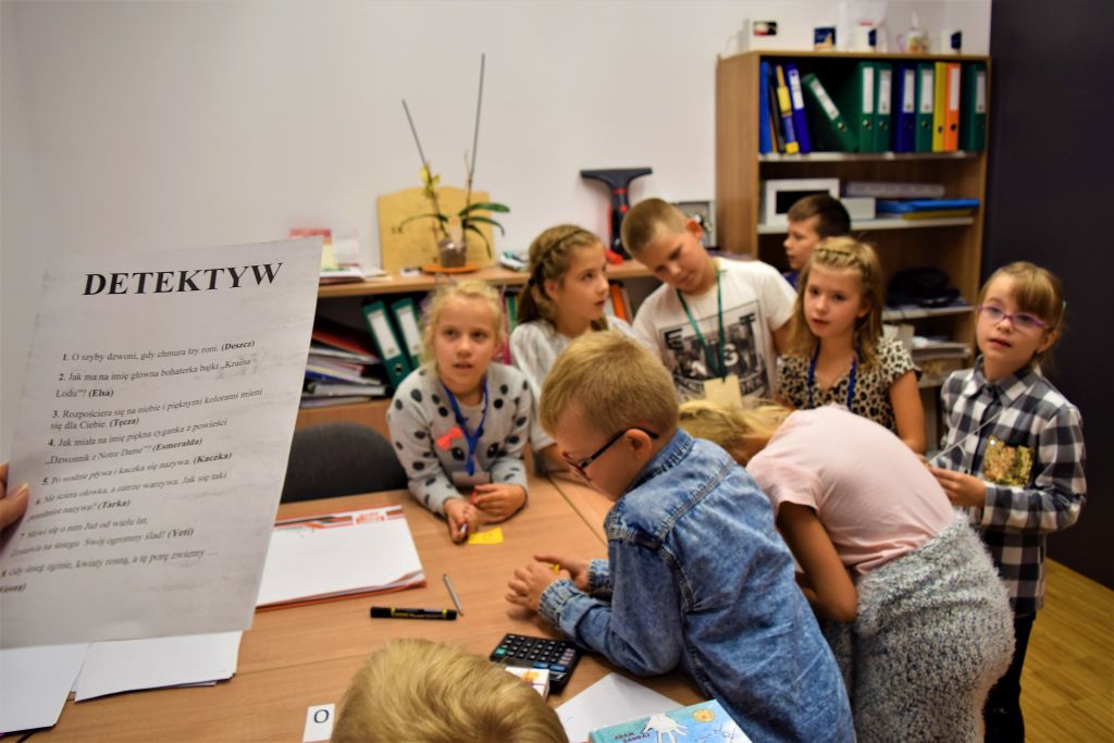 W drugiej części warsztatów dzieci miały za zadanie zdobyć kod do walizki, w której były ukryte skarby. W formie gry terenowej, uczestnicy w grupach biegali do różnych pokoi, w których czekało na nich wiele detektywistycznych zadań. Niesamowita współpraca a także zaangażowanie i dobra zabawa nie opuszczała naszych śledczych. Każdy punkt wymagał od dzieci nie tylko wykorzystania zdobytej wcześniej wiedzy ale również współpracy i umiejętności logicznego myślenia. Bez większych problemów udało się wszystkim grupom zdobyć kod do walizki, w której ukryte były prezenty! Każdy uczestnik otrzymał dyplom Detektywa oraz paczkę z bibliotecznymi prezentami!