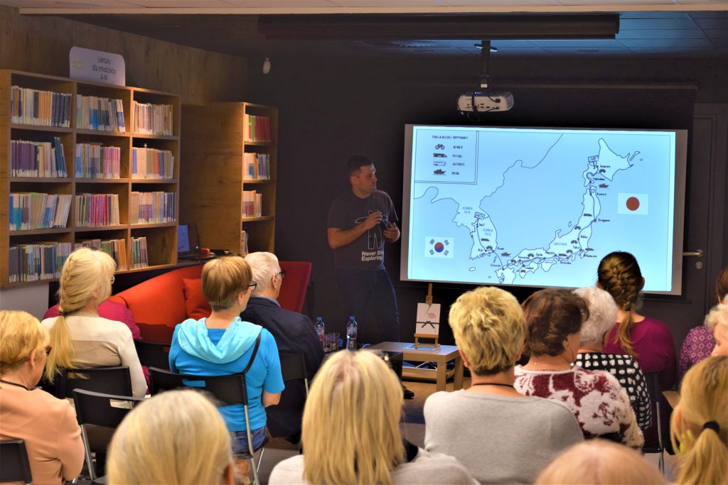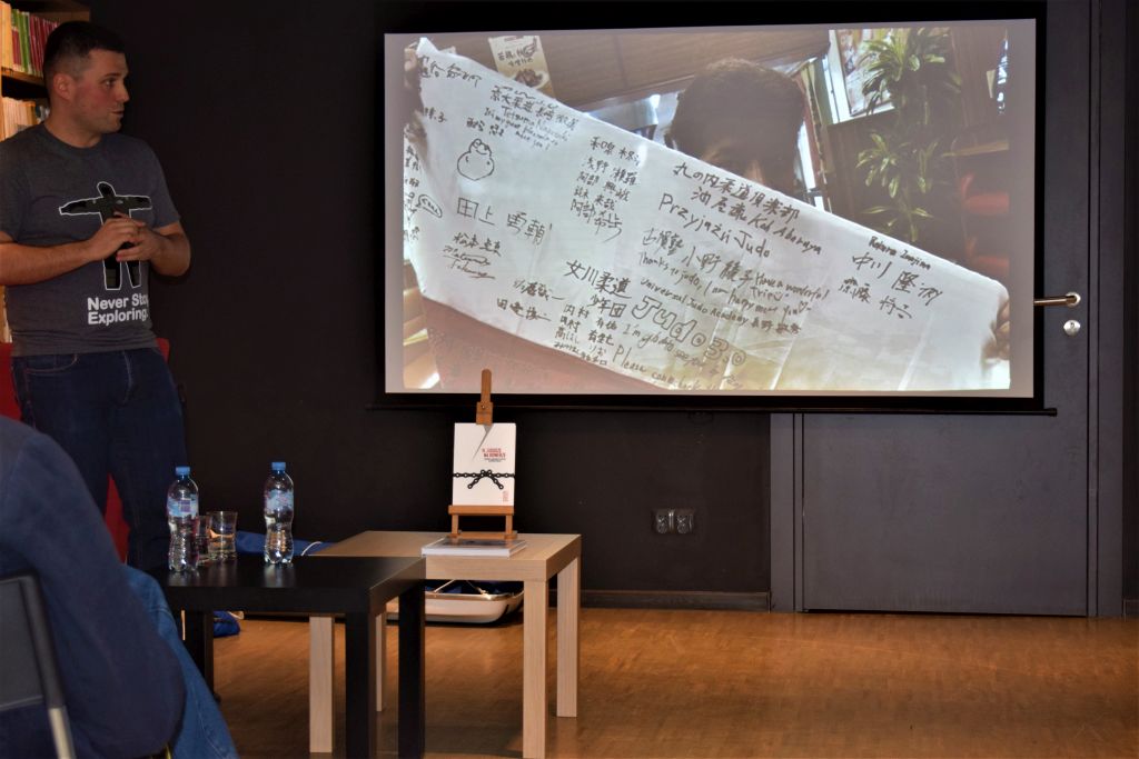 Pan Artur od 20 lat trenuje judo(stopień mistrzowski 1– dan). Przemierzył Kraj Kwitnącej Wiśni i Koreę na dwóch kółkach trenując judo w lokalnych klubach. Razem jako team przeszli pieszo przez Bajkał 400 km, w międzyczasie brali udział w maratonie Rovaniemi 150 km, niedawno wrócili z wyprawy autem wokół Islandii pokonując 1,5 tys.km. Nie są to wyprawy łatwe. Swoimi wrażeniami z podróży dzielą się pisząc i wydając książki, do tej pory wyszły dwie: „W judodze na rowerze. Japońsko-koreańska przygoda na dwóch kółkach..” oraz „Zostawieni na lodzie. Piesza przeprawa przez Bajkał”. Całości dopełniają piękne fotografie. Książki można było nabyć po spotkaniu i otrzymać autograf Autora.