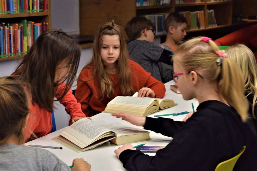 Wstępem do zajęć była krzyżówka, której hasło brzmiało "SŁOWNIKI". Dzieci poznały dziś słownik języka polskiego, poprawnej polszczyzny, wyrazów bliskoznacznych a także ortograficzny. Wyszukiwały pojęć, sprawdzały pisownie wyrazów oraz wyszukiwały synonimów. Szukanie haseł w słownikach wcale nie należy do łatwych rzeczy. Uczniowie angażując się w pracę z pomyślnością wykonali wszystkie zadania. Dzisiejsze spotkanie było też dobrą okazją do zapoznania się z bibliotecznym katalogiem on-line. W ten sposób możemy sprawdzić czy dana książka jest dostępna w bibliotece lub wyszukać interesujących nas pozycji. Jest również możliwość zarezerwowania książki a także sprawdzenia naszego konta bibliotecznego, czyli sprawdzenie ile aktualnie posiadamy egzemplarzy książek w wypożyczeniu.