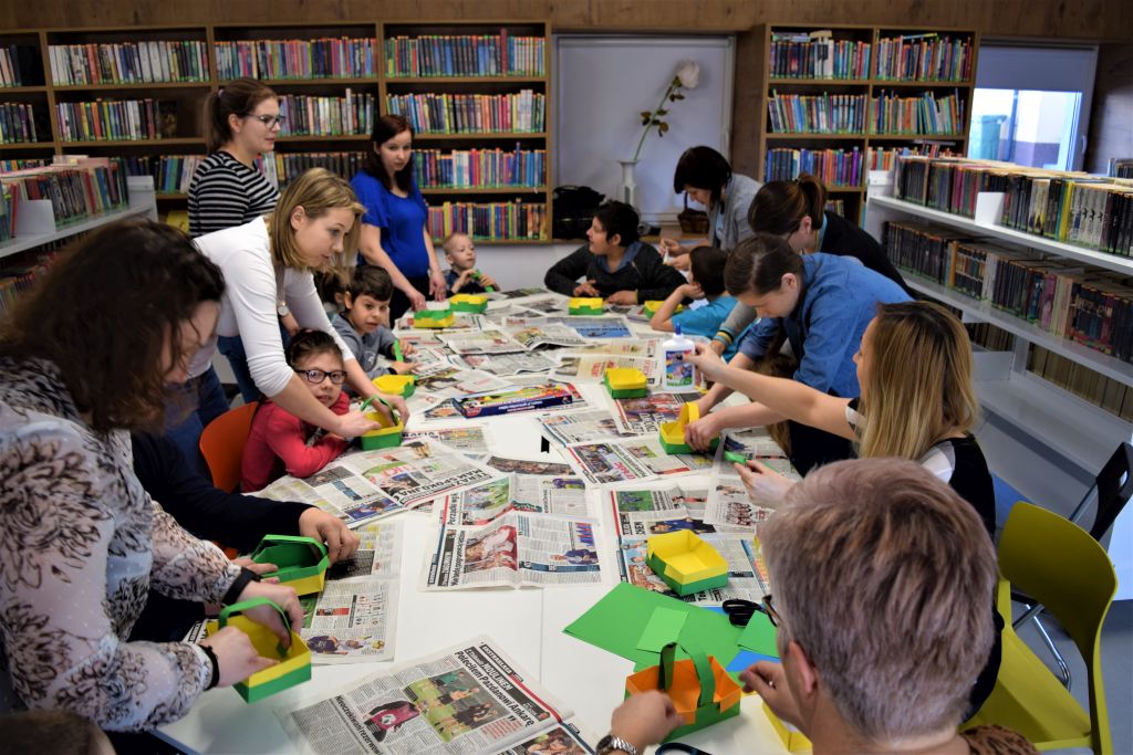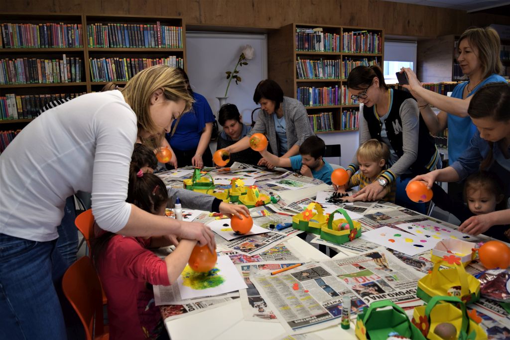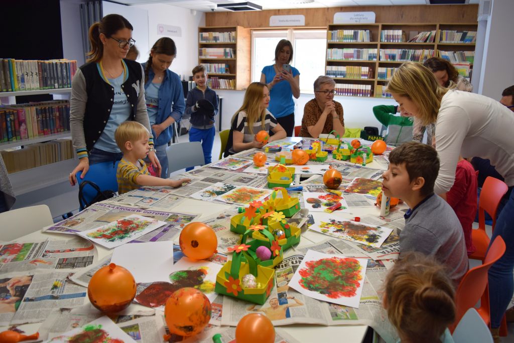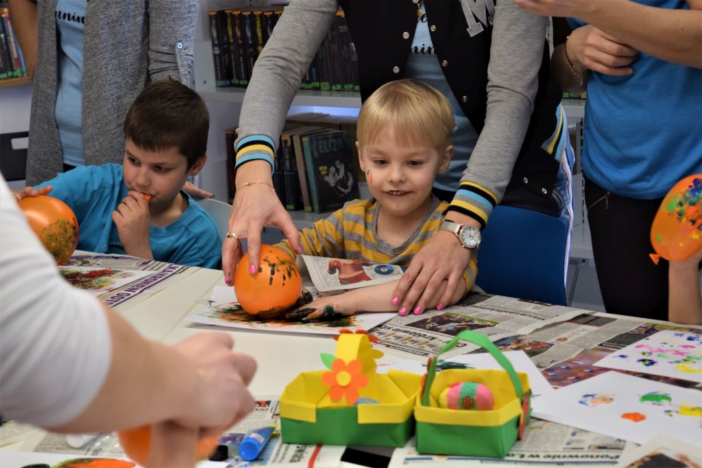 Piękne kolorowe zajęcia przypomniały dzieciom o wiośnie a także o zbliżających się świętach wielkanocnych. Dzieci wykonały papierowy koszyczek, do którego włożyły pisanki i małe, słodkie jajeczka czekoladowe. Dzisiejsze spotkanie było również fantastyczną okazją aby namalować niekonwencjonalną metodą obrazek oczywiście w wiosennych barwach. Dzieci dobrze się bawiły, miło spędziły czas a przede wszystkim zaprzyjaźniły się z naszą instytucją oraz pracownikami biblioteki.