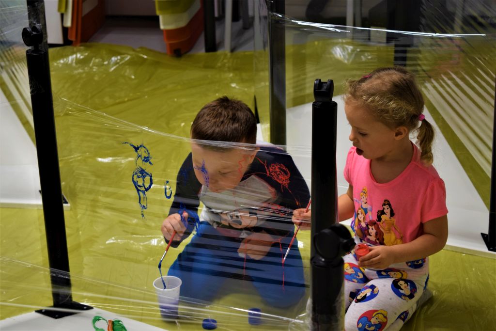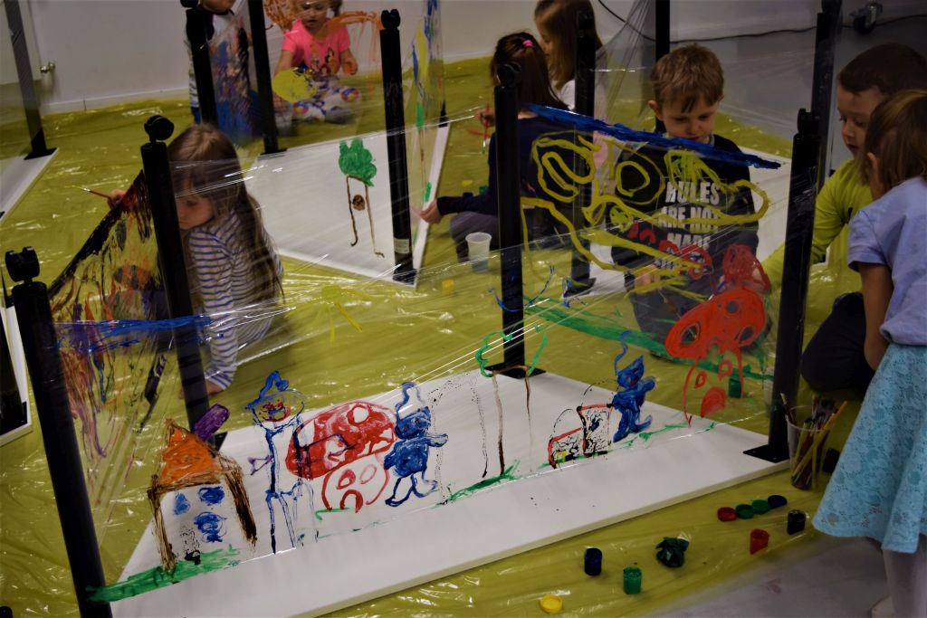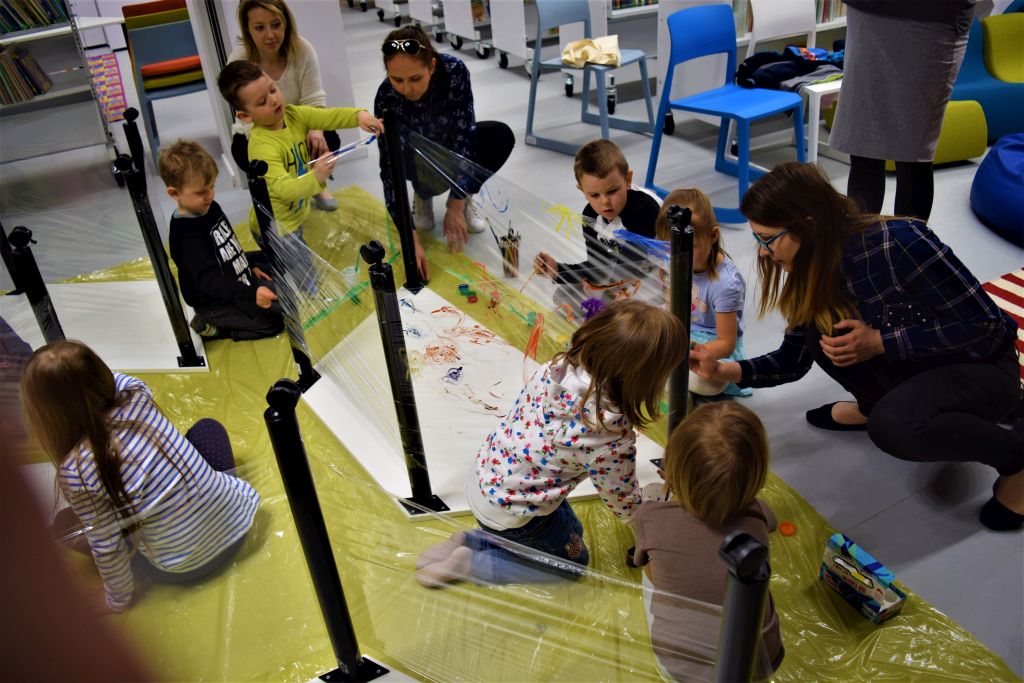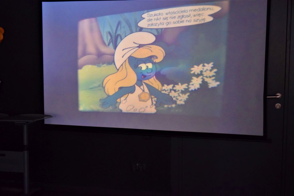 Przedszkolaki z chęcią uczestniczyły w rozmowie dotyczącej bajek oraz czasów, kiedy nie było smartfonów, tabletów, laptopów. Największym zaskoczeniem okazał się rzutnik „Ania”, na którym kiedyś wyświetlane były bajki. W dalszej części zajęć grupa miała okazję przenieść się w przeszłość i obejrzeć krótką bajkę z napisami wyświetlaną na rzutniku. Atmosfera „starego kina” udzieliła się wszystkim. Pierwszą część zajęć zakończyła zabawa z odgadywaniem tytułów oraz postaci z bajek. Podsumowaniem dzisiejszych zajęć było malowanie farbami plakatowymi na przygotowanych wcześniej foliach. Nasza biblioteka zamieniła się w iście bajkowy świat! Powstała przepiękna wioska Smerfów.