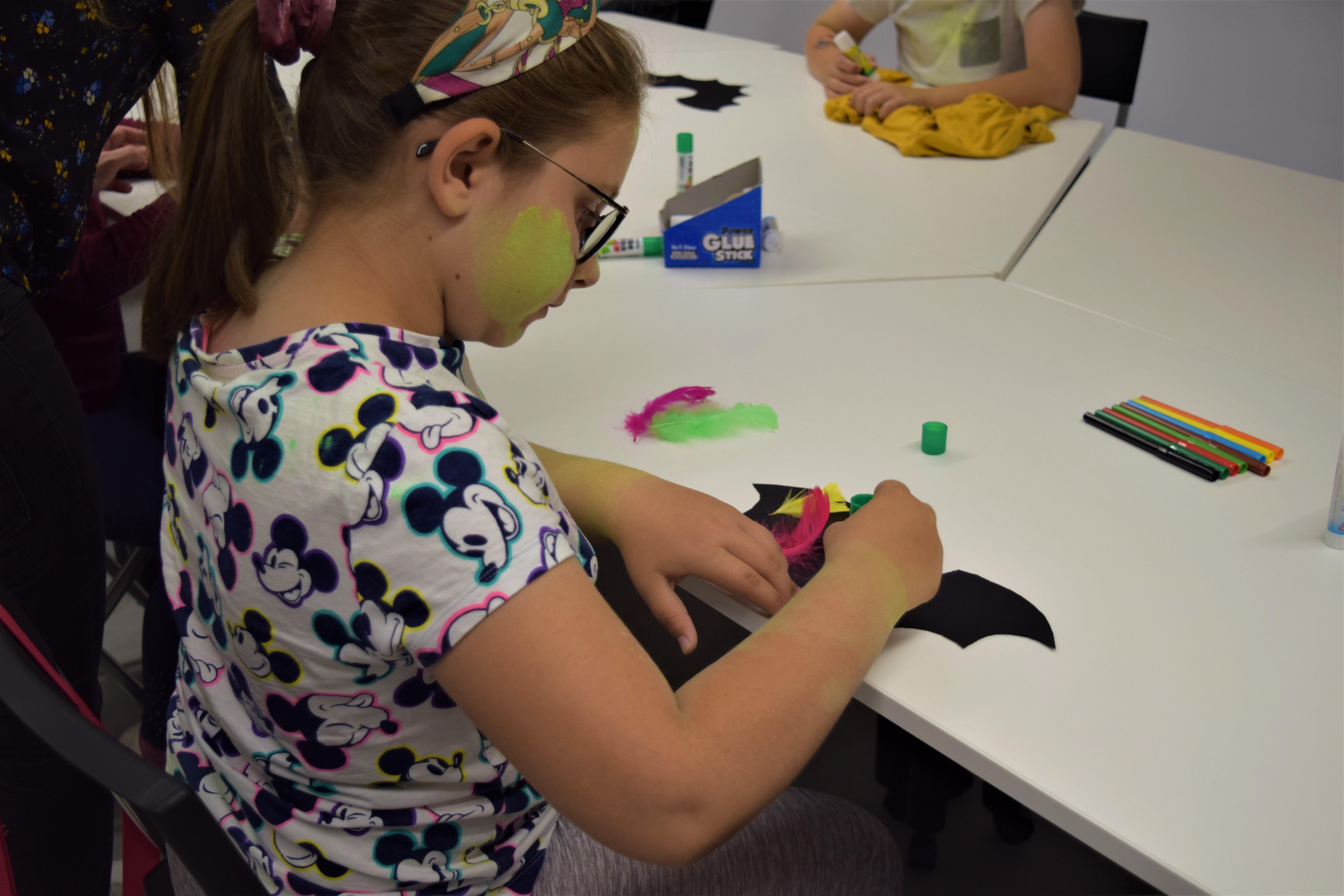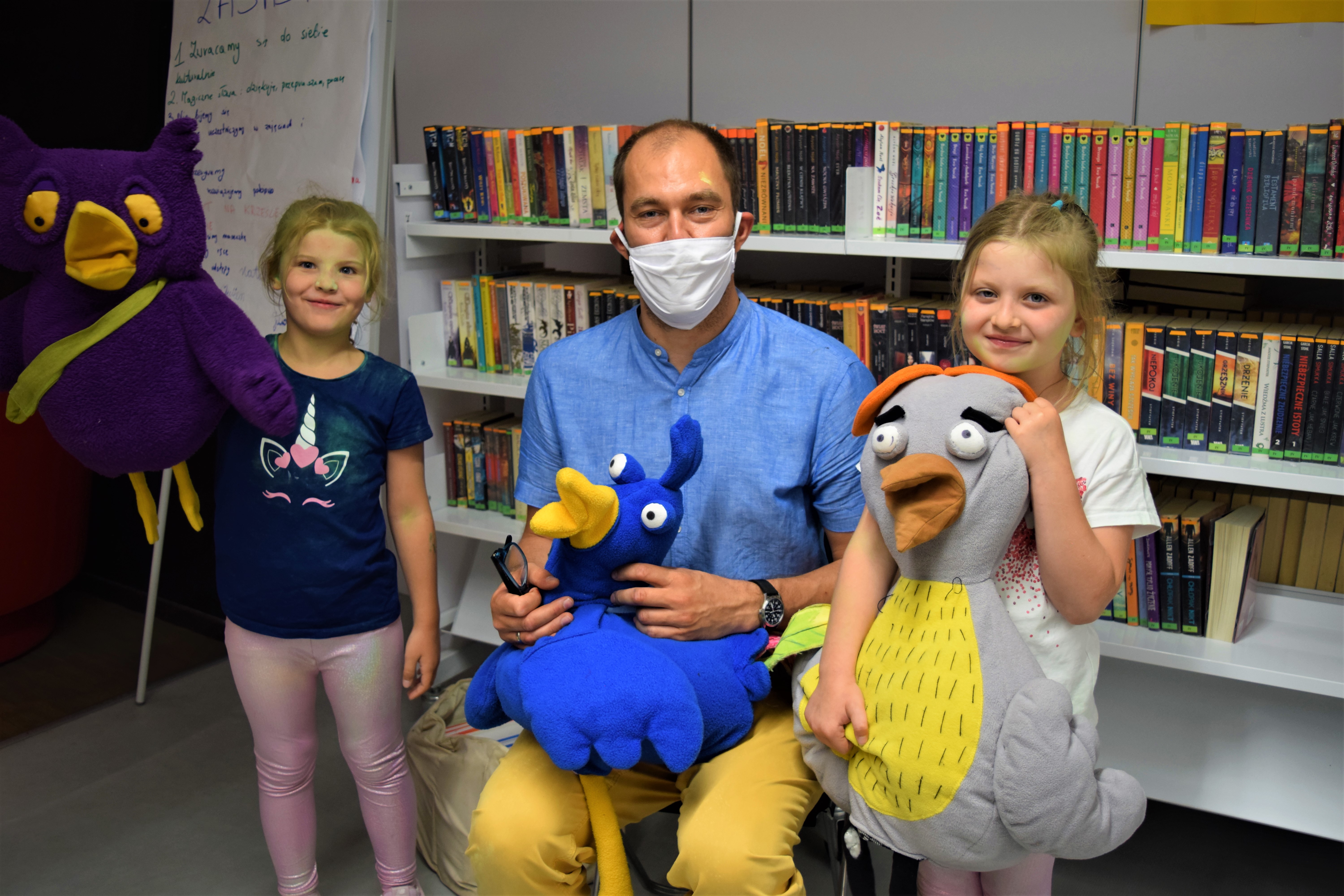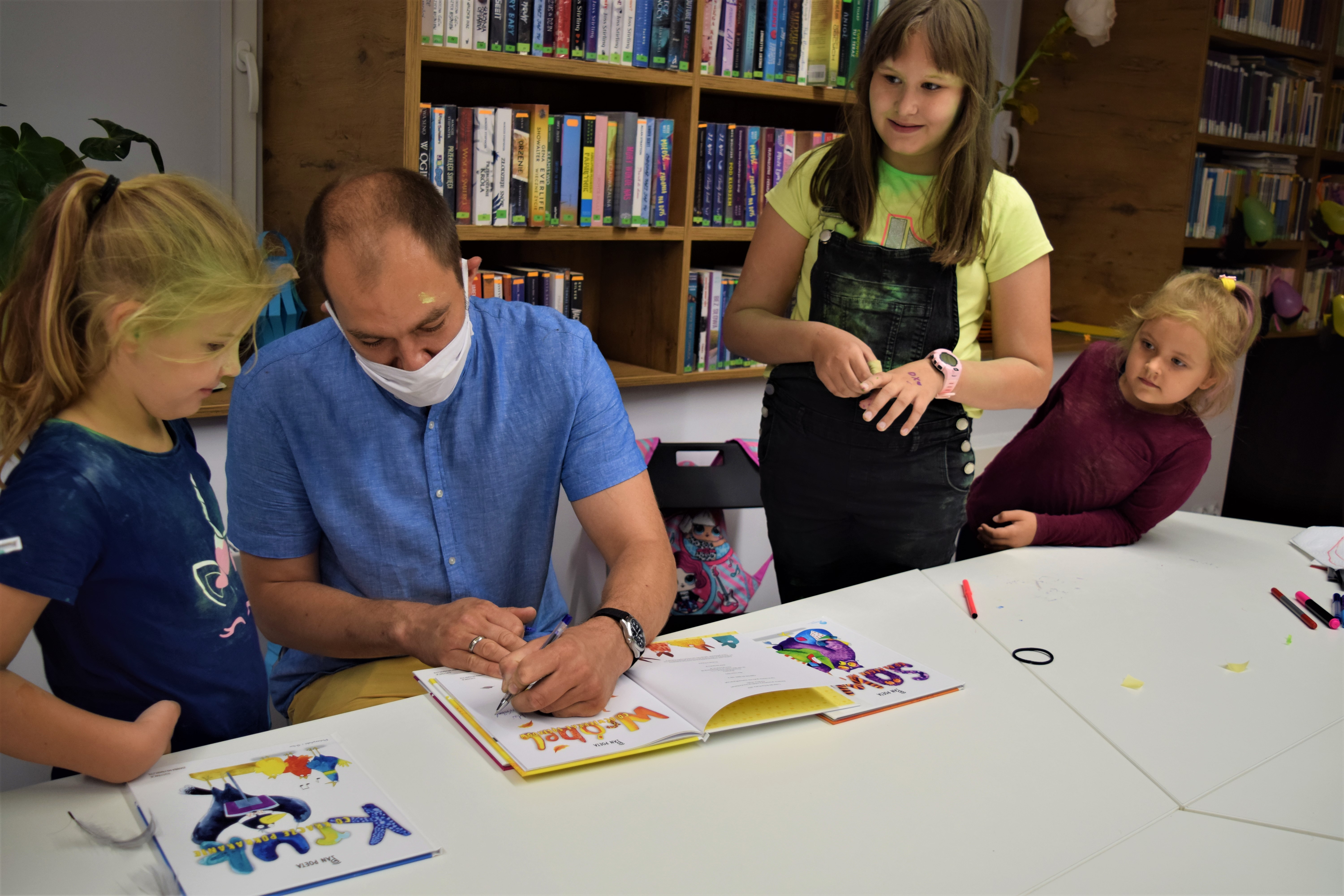 Było bardzo wesoło i kolorowo. Dzieci poznały historię pawia, kury, sowy, kruka i kaczki. Opowieści stały się punktem wyjścia do świetnej zabawy. Nasi mali uczestnicy wykonali pracę plastyczną nietoperza, z balonów i piórek, bawiły się chustą animacyjną. Nie lada atrakcją okazało się rysowanie zawartości brzuszka kury, która pokazywała się po położeniu ręcznika kuchennego na talerzu z wodą. Powstały kolorowe obrazki, które dzieciom bardzo się podobały. Był też czas na autografy i wybór książek.