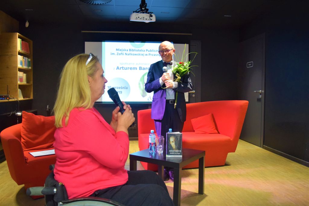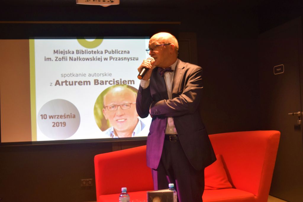 Wtorkowe, wrześniowe popołudnie, sala wielofunkcyjna biblioteki wypełniona publicznością. Wszyscy czekają na bohatera spotkania Pana Artura Barcisia - pojawia się na scenie witany gromkimi brawami. Znakomitego gościa powitała Pani dyrektor Małgorzata Sobiesiak. W trakcie spotkania aktor opowiadał o swoim dzieciństwie, początkach kariery, ważnych rolach filmowych ,pracy w teatrze oraz serialach „Miodowe lata” i ”Ranczo”.