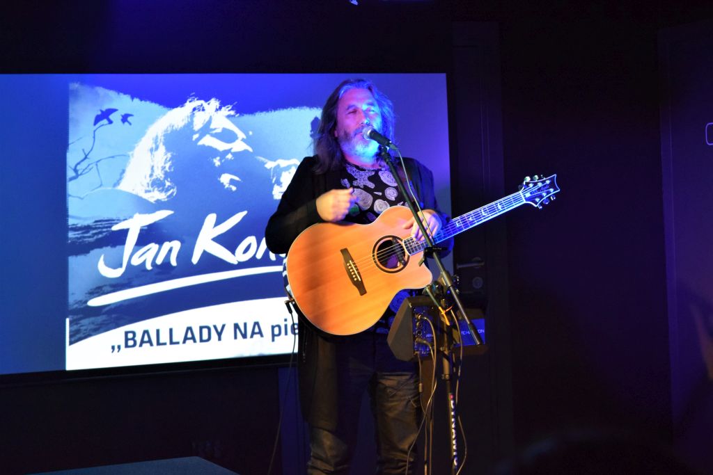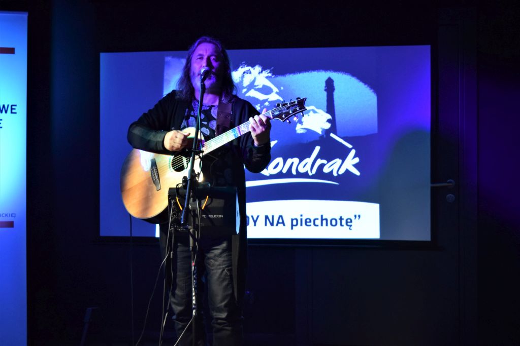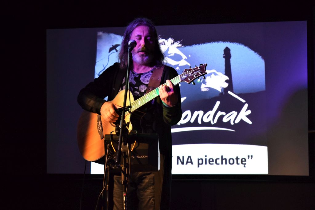 W drugiej części spotkania ,muzycznym wydarzeniem był koncert Jana Kondraka- cenionego autora i kompozytora. pt. ”BALLADY NA piechotę”. Kojarzonego z wyjątkową piwnicą artystyczną, jaką jest Lubelska Federacja Bardów, której jest współzałożycielem.