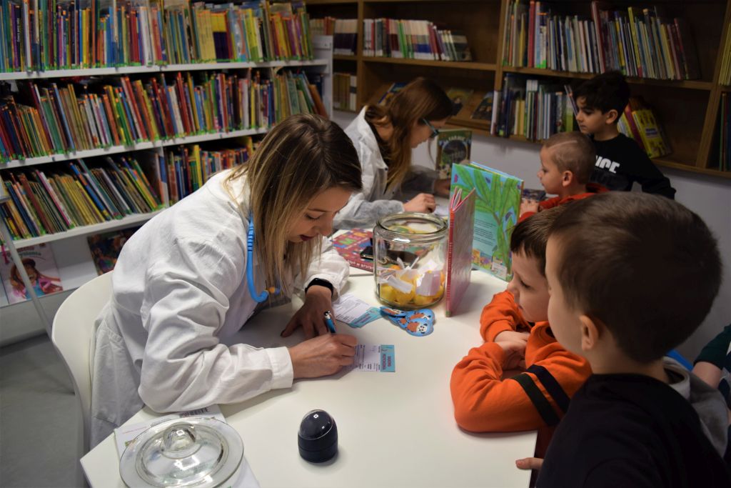 Podsumowaniem dzisiejszych zajęć była Bajkowa Przychodnia, w której panie bibliotekarki wypisały każdemu dziecku jego własną receptę i zalecenia czytelnicze aby np.: Czytać dziecku 20 minut dziennie a także osobiście poleconą książkę zgodną z zainteresowaniami dziecka.