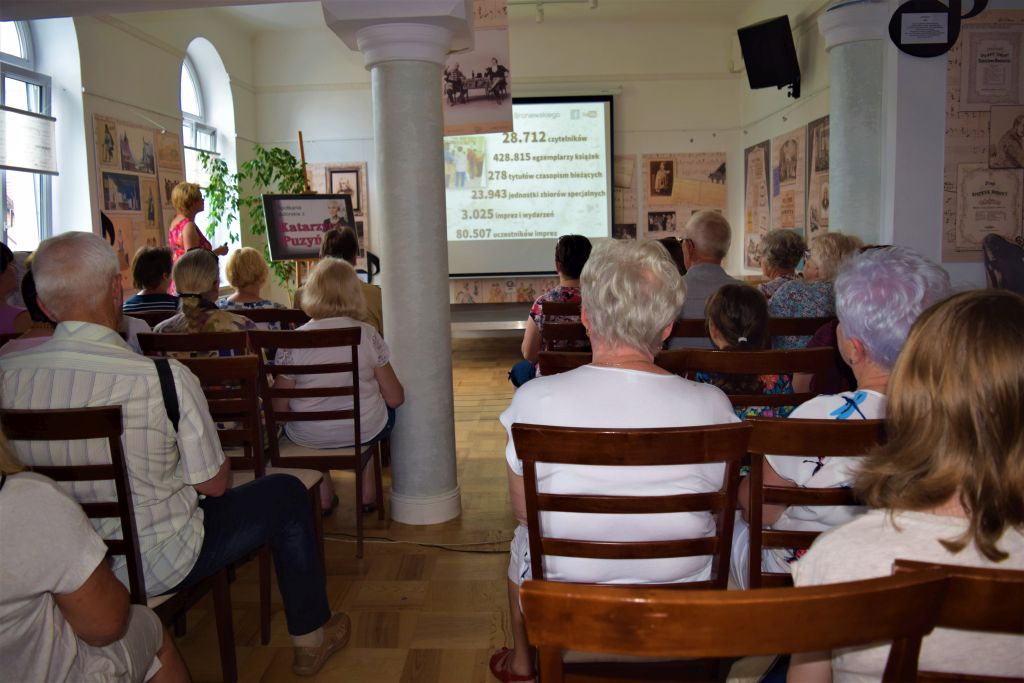 Pierwszym punktem wyprawy było zwiedzanie Książnicy Płockiej. Pani Joanna Banasiak – Dyrektor Książnicy przybliżyła nam historię budynku oraz opowiedziała o działaniach realizowanych w ciągu roku. Dowiedzieliśmy się, że eklektyczny budynek został wzniesiony w roku 1902 dla Towarzystwa Kredytowego Ziemskiego. Autorami projektu byli: Apoloniusz Paweł Nieniewski i Władysław Adolf Kozłowski. W 1934 r. budynek stał się własnością Zgromadzenia Sióstr Służek Najświętszej Marii Panny Niepokalanej, w rękach którego pozostawał ponad 50 lat. W 1989 r. siostry sprzedały budynek na potrzeby Wojewódzkiej Biblioteki Publicznej w Płocku. Obecnie Książnica Płocka gromadzi i udostępnia bogate i różnorodne zbiory w gmachu głównym, 13 filiach, Bibliotece dla dzieci, dziale zbiorów audiowizualnych.